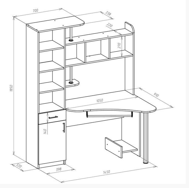 Получается удобное рабочее место, где можно комфортно работать за компьютером или работать с документами. Под столешницей располагается клавиатурная полка. Исполнение может быть левостороннее и правостороннее (определяется по углу столешницы).