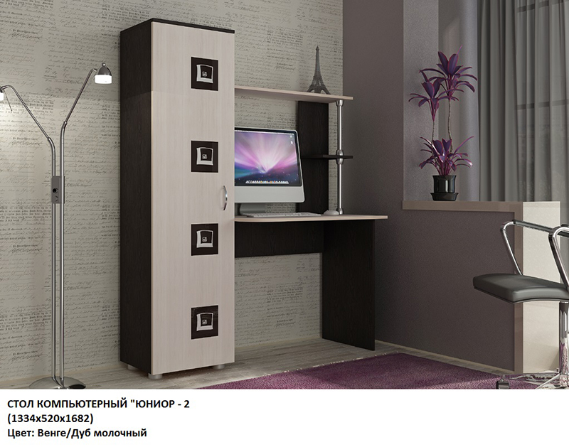 Стильный компьютерный стол «Юниор-2» поможет создать современное и комфортное рабочее место не только дома, но и в офисе, не занимая слишком много места. Стол имеет универсальный шкаф с полками для хранения попок с бумагами или учебников, а также открытую полку для различных предметов, зафиксированную на столешнице.