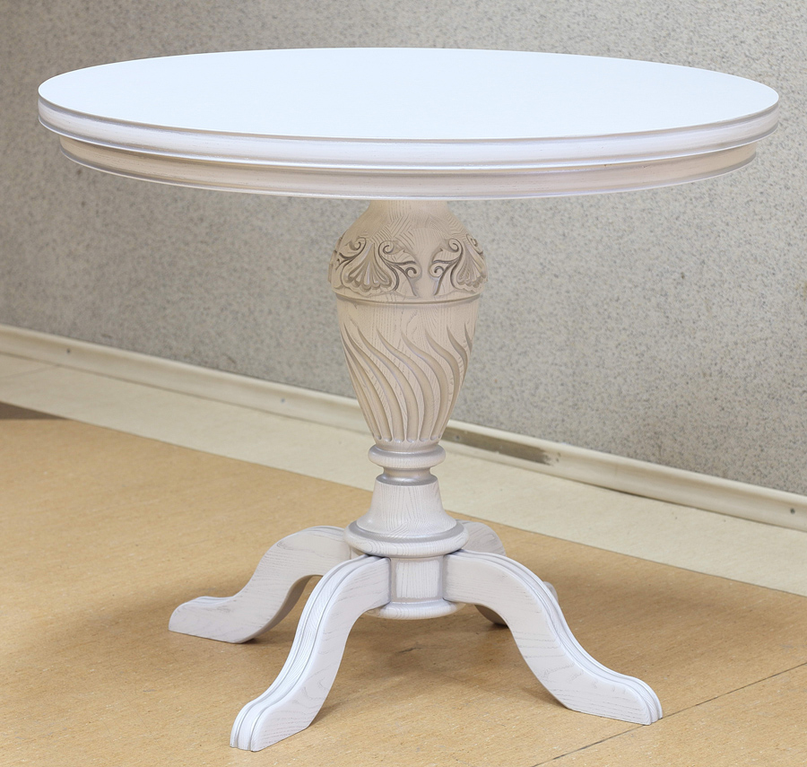 Стол имеет круглую форму, отличается компактными габаритами. Материалом изготовления служит натуральный массив дерева. Опора украшена резными узорами. Модель станет не только удобным местом для трапезы, но и эффектным элементом интерьера.