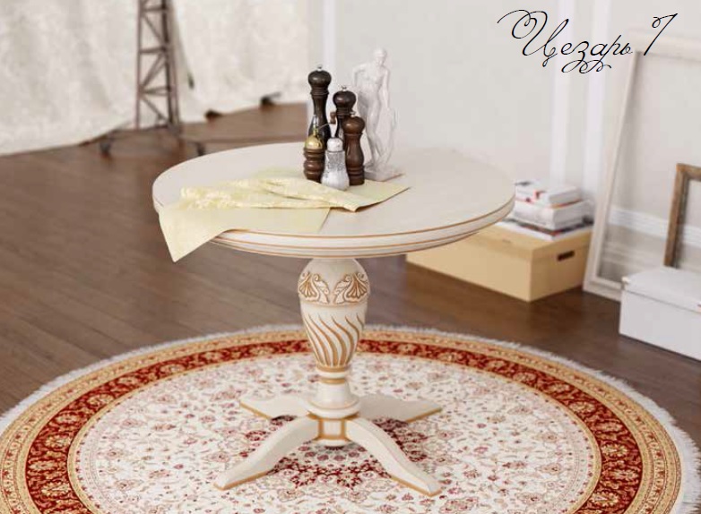 Небольшой круглый обеденный стол «Цезарь-1» выполнен в белом цвете с элементами золотого. Должную устойчивость этому элегантному предмету интерьера придают 4 широкие ножки у основания. Такой столик хорошо впишется в интерьер в классическом стиле.