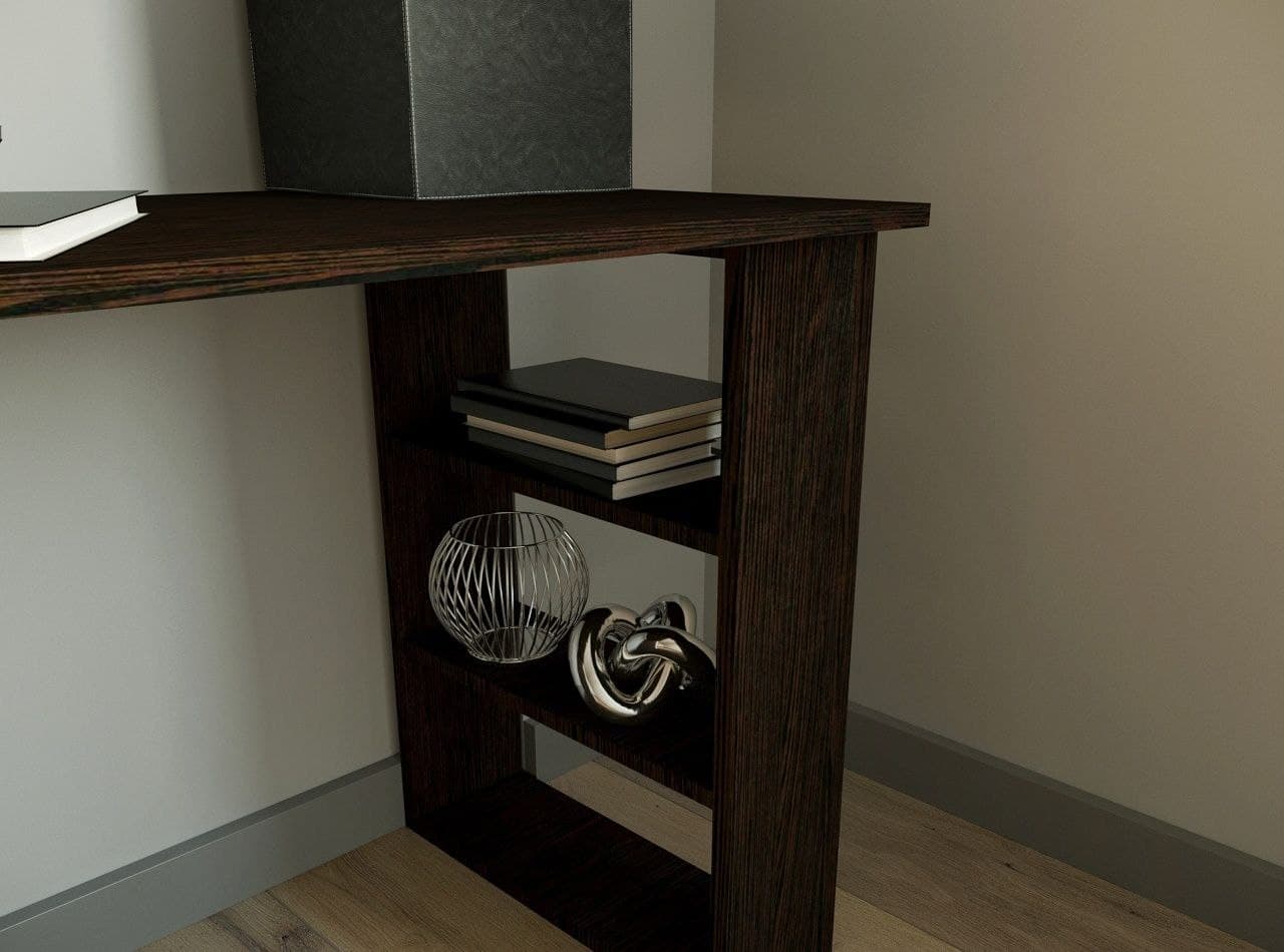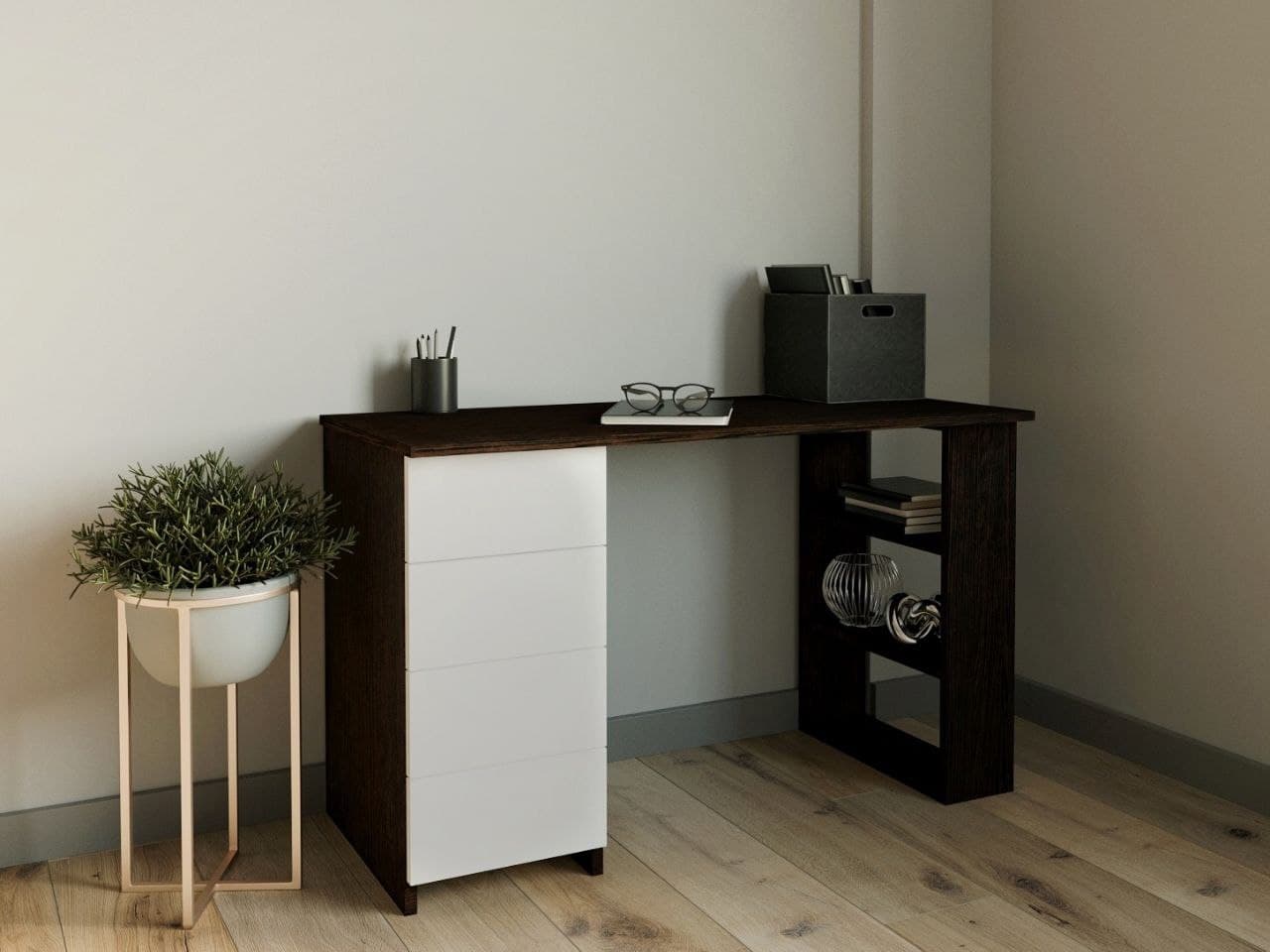 Оснащен четырьмя выдвижными ящика и открытыми полками на опоре.
