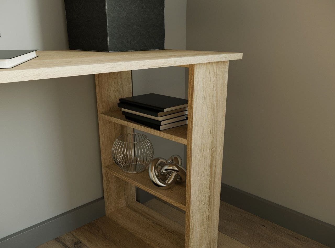 Оснащен четырьмя выдвижными ящика и открытыми полками на опоре.