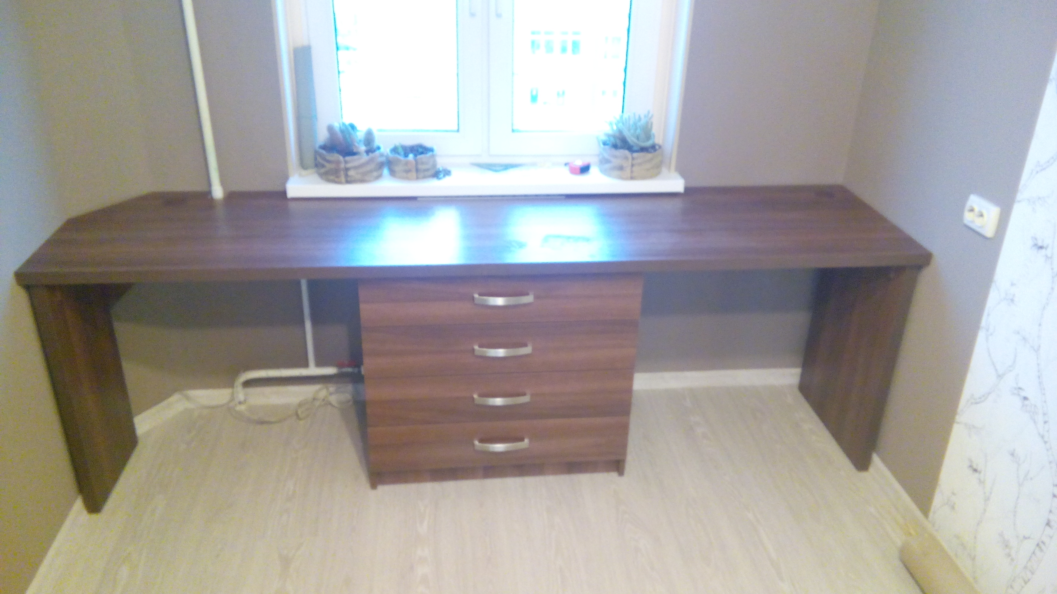 Стол выполнен в темном древесном цвете. Изделию свойственны легкие переливы. Фурнитура светлого металлического цвета очень прочная и удобная в эксплуатации.