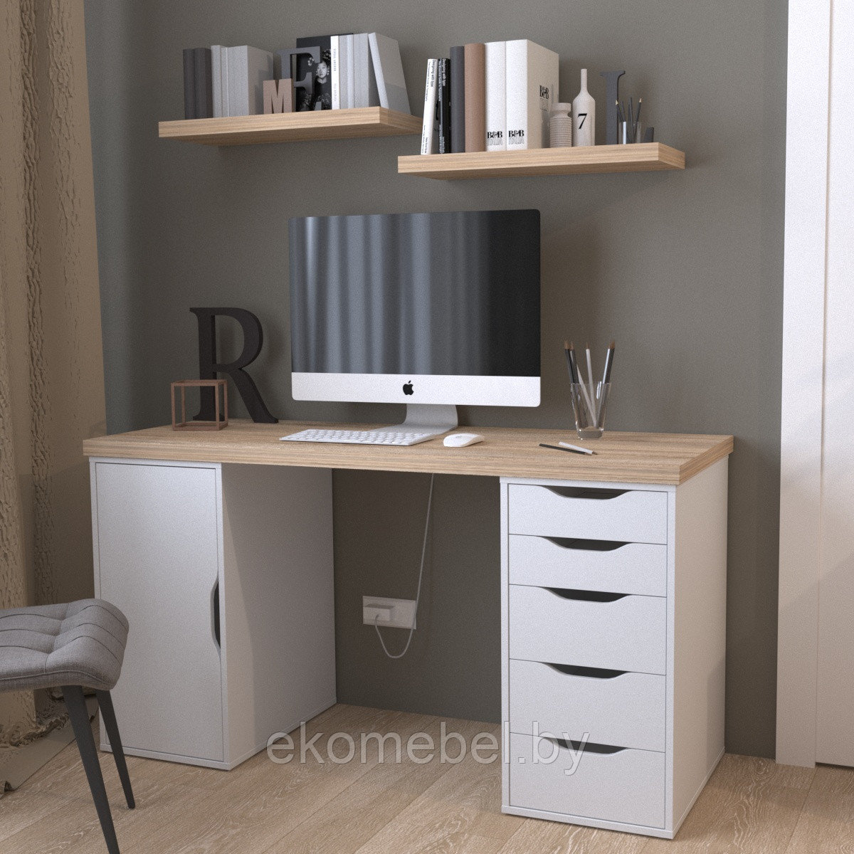 Письменный стол оснащен вместительным комодам с дверцей и комодом с 5-ю шуфлядками. Комоды можно устанавливать на любую сторону.