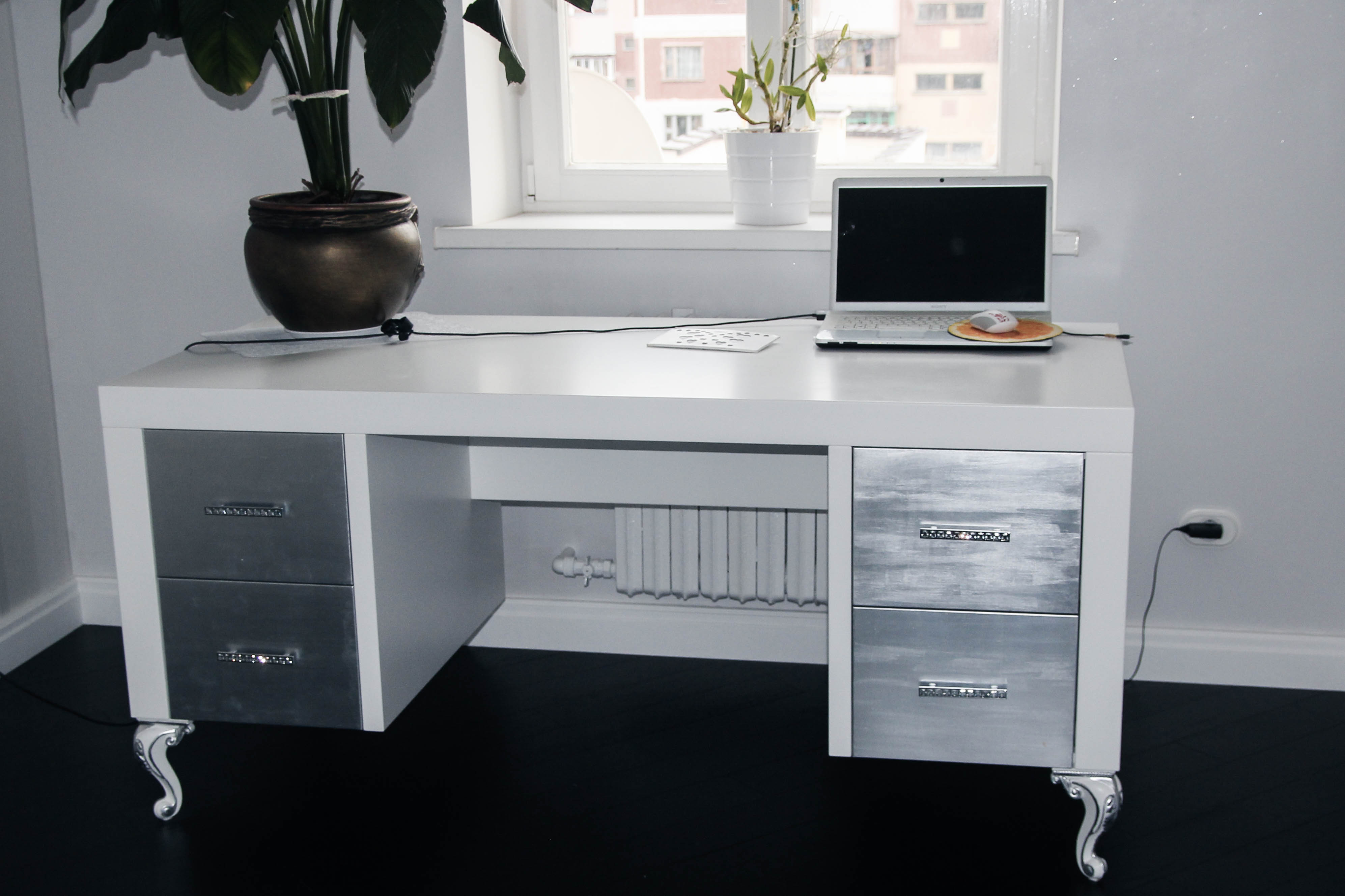 Оригинальный письменный стол изготовлен из прочного и качественного массива. Гладкая белая столешница вместительна, фасады выдвижных ящиков изготовлены в алюминии с изысканными блестящими ручками. Массивные фигурные ножки создают впечатление массивности стола.