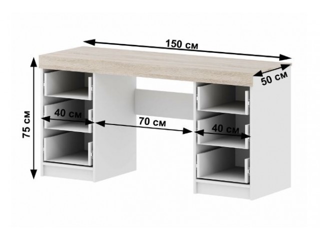 Размеры (ДхГхВ): 140х55х75 см. 2 тумбы с пятью выдвижными ящиками в каждой.
