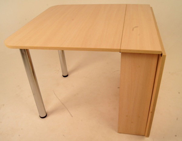 В сложенном виде стол практически не занимает места, что делает его практичной и универсальной конструкцией. Модель имеет прямоугольную форму. Округленные углы делают стол безопасным при случайном столкновении.
