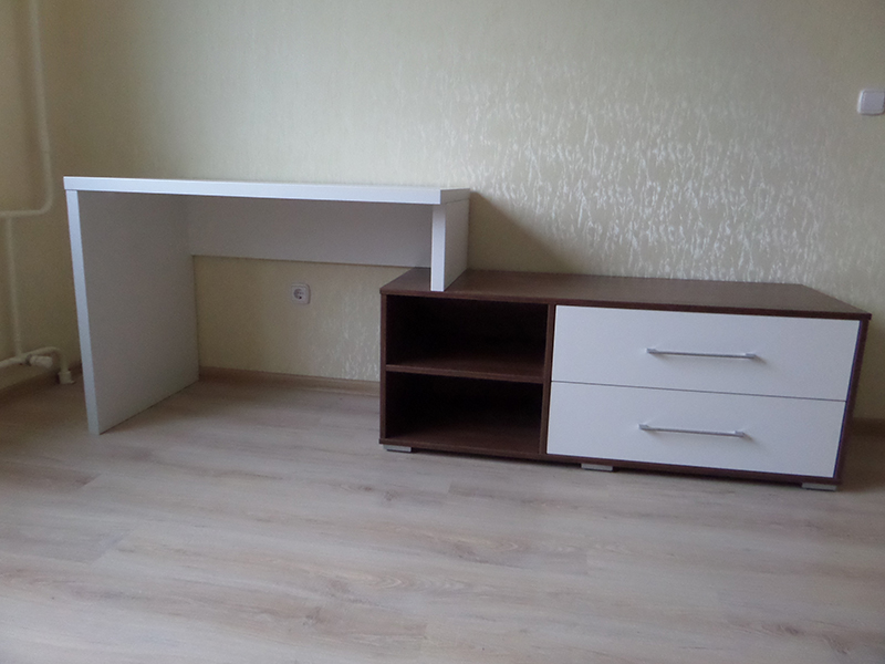 Стол с большой и удобной тумбой подойдет как для кабинета, так и для детской комнаты. В комплекте имеется несколько вместительных выдвижных ящиков и две открытые полки для папок и других вещей. Ящики оборудованы металлическими ручками, покрытыми хромом.