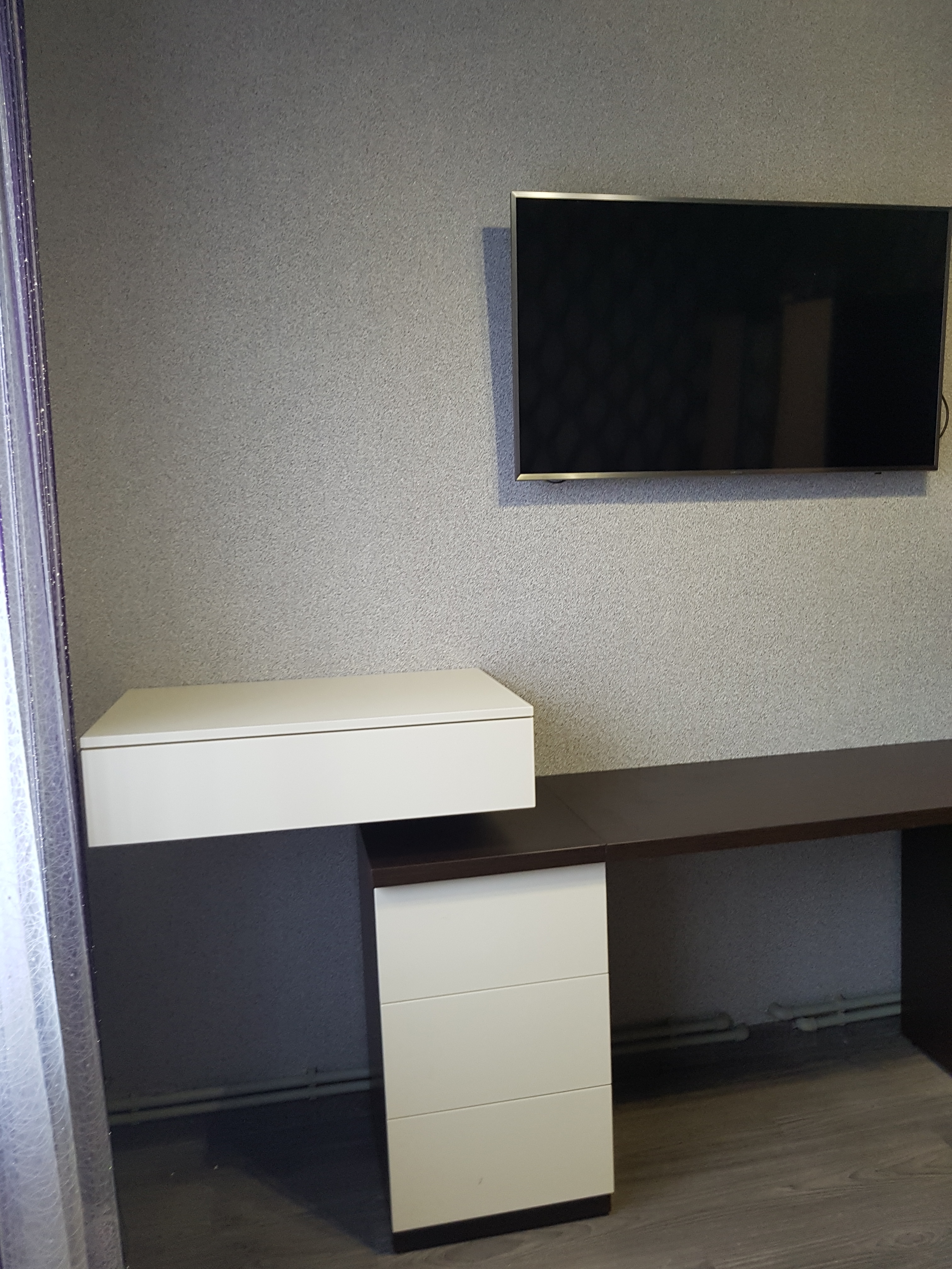 Компактная конструкция с удобной фигурной кромкой столешницы.