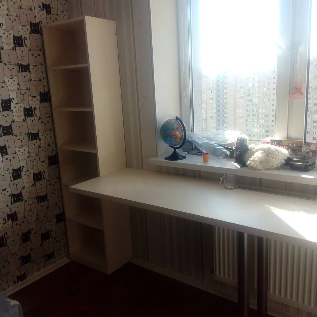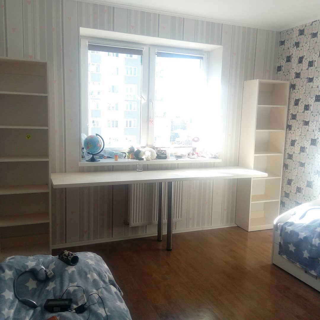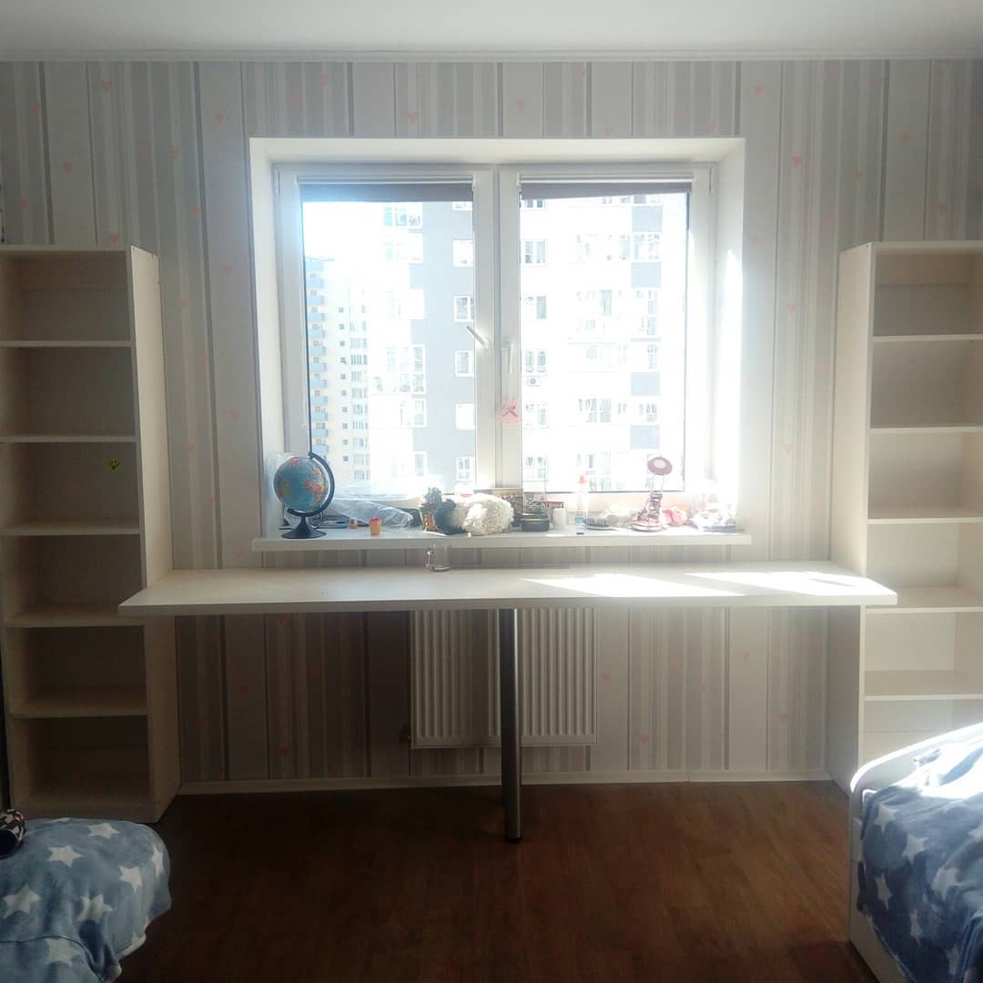 В комплект входит: 2 стеллажа, 2 навесные полки с Z4-фасадами, 2 угловых письменных стола.