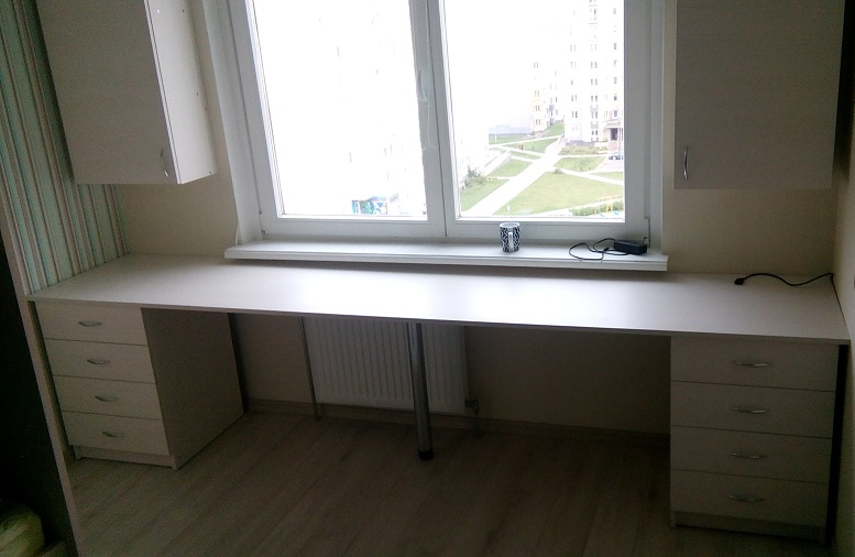 Практичный стол из ЛДСП с двумя полками на столешнице.