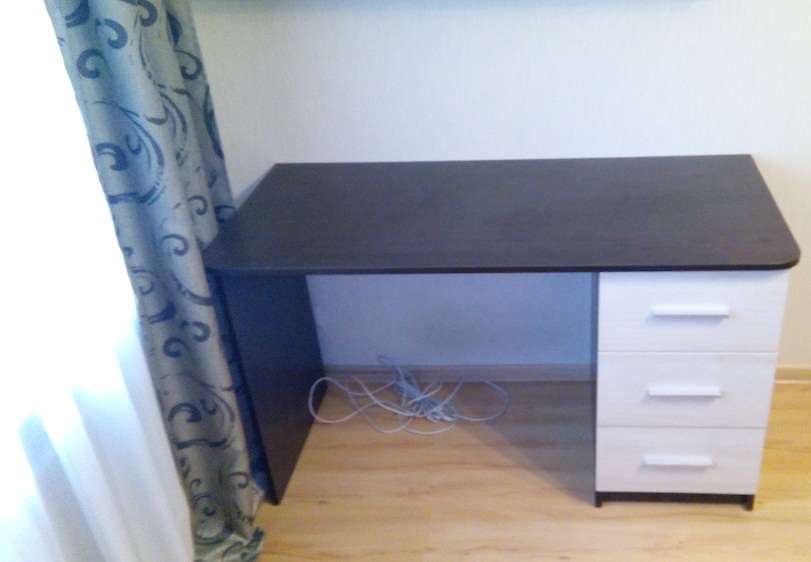 Прямой рабочий стол с закругленными углами. Корпус и столешница цвета венге, в контраст светлому фасаду тумбы.