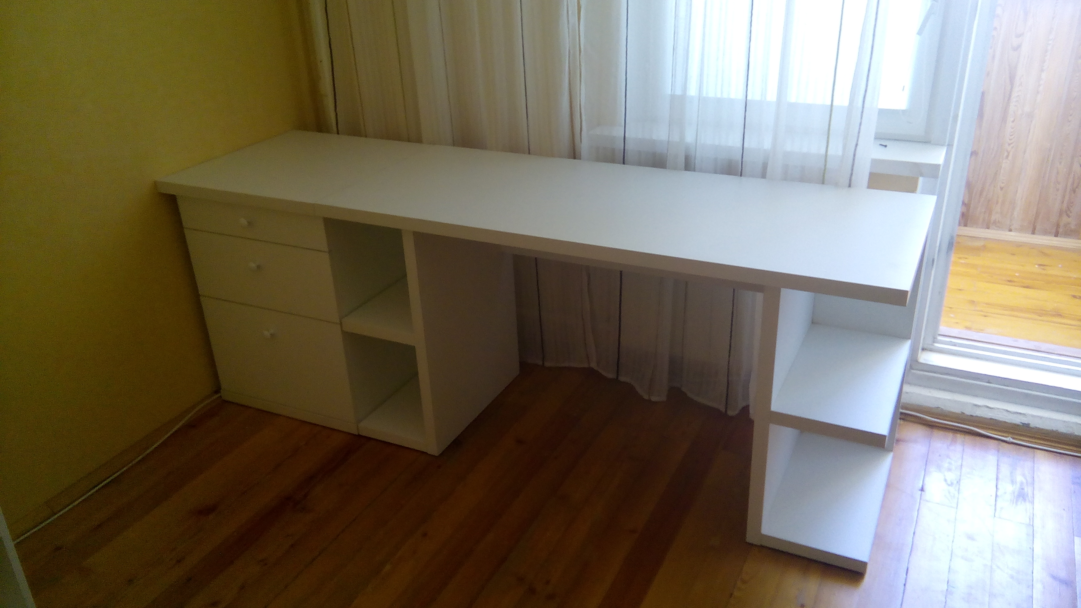 Двухместный стол для размещения в детской со сдвоенной тумбой и фигурной кромкой широкой столешницы.