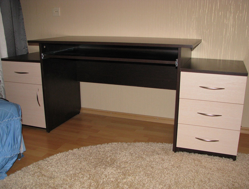 Модель выполнена из ламинированного ДСП (18 мм), отделка из ПВХ. Направляющие в тумбах L400 ролики; на выдвижной клавиатуре - роликовые.
