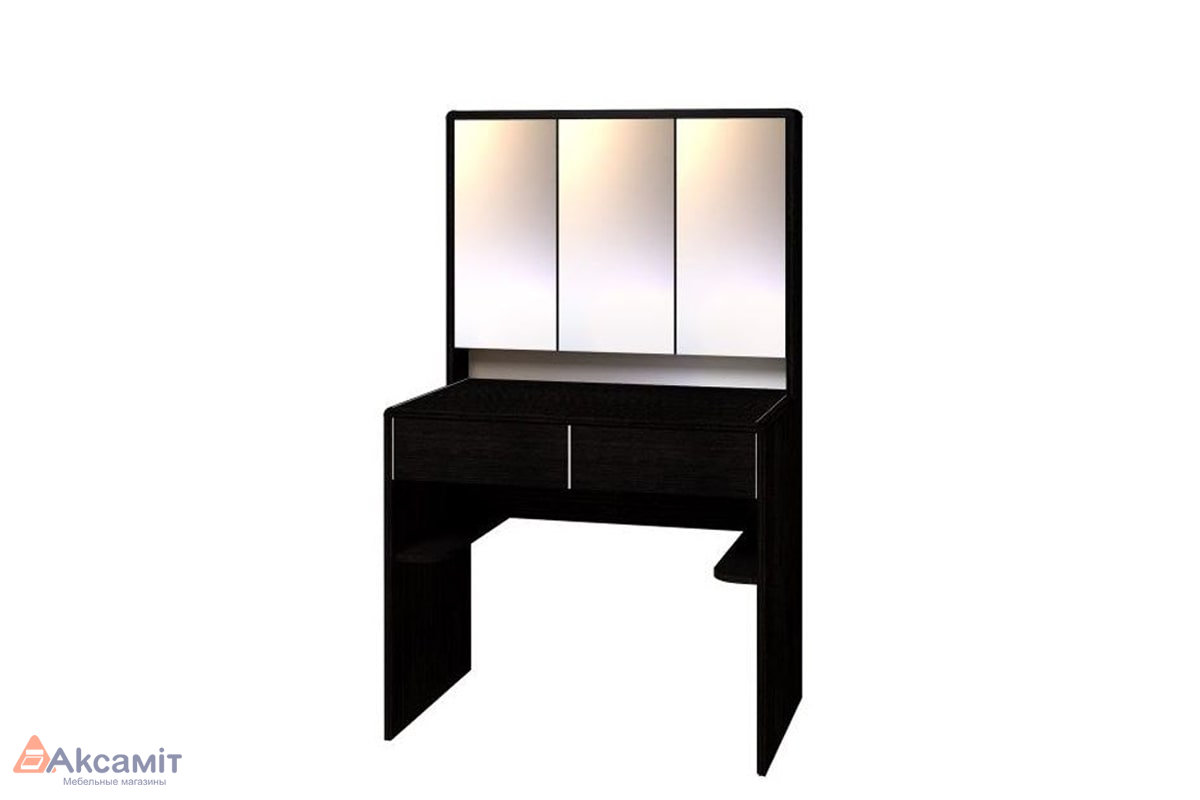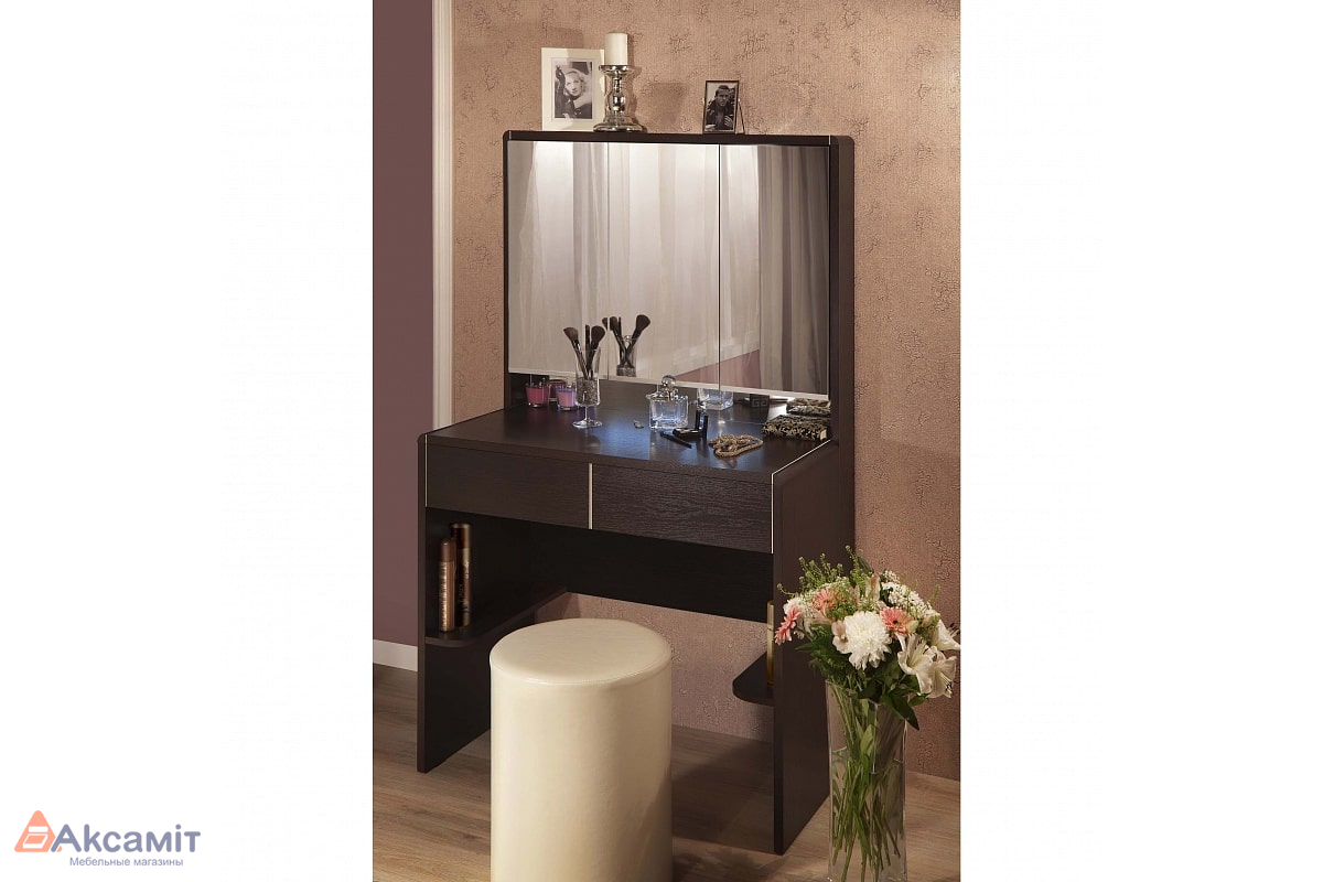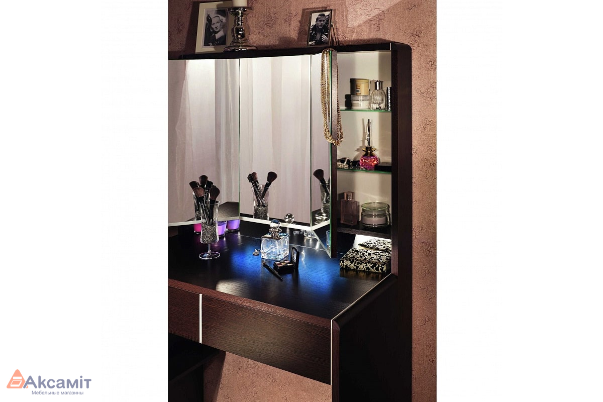 Туалетный столик — трельяж. Это один из самых желанных предметов мебели для женщин. Зеркало с одной стационарной и двумя подвижными створками позволяет разглядеть себя со всех сторон. Трельяж с зеркалом идеален для тех, кто любит следить за своей внешностью, ухаживать за лицом, делать прически и укладки. Просторная столешница со скругленными углами и зеркала создают ощущение комфорта и легкости. Ящики туалетного столика декорированы белой кромкой 2 мм. Ряд стеклополок (стеклополка толщиной 4 мм, по 2 с каждой стороны) скрыт за зеркальными створками. Здесь возможно «спрятать» и аккуратно расставить баночки с кремами и любимые парфюмы. Под столешницей трельяжа предусмотрены полочки со скругленными углами для хранения высоких флаконов со средствами по уходу за волосами, антистатиков, высоких коробочек, т.е. для всего того, что ежедневно необходимо каждой женщине, но очень загромождает столешницу туалетного столика. Выпускается только в декоре Венге. Декоративная светодиодная Подсветка для BERLIN 35 Стол туалетный привнесет таинственности в этот поистине женский предмет мебели (Светодиодная подсветка - дополнительная опция, докупается и устанавлипвается по желанию к модулю BERLIN 35 Стол туалетный)