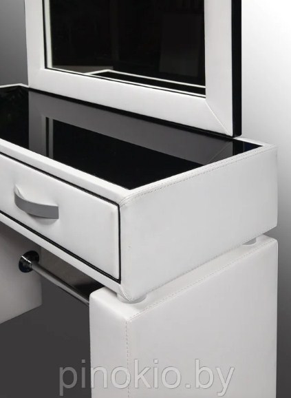 Туалетный стол комплектуется подпятниками, столешница может быть со стеклом, МДФ либо в ткани/экокоже.