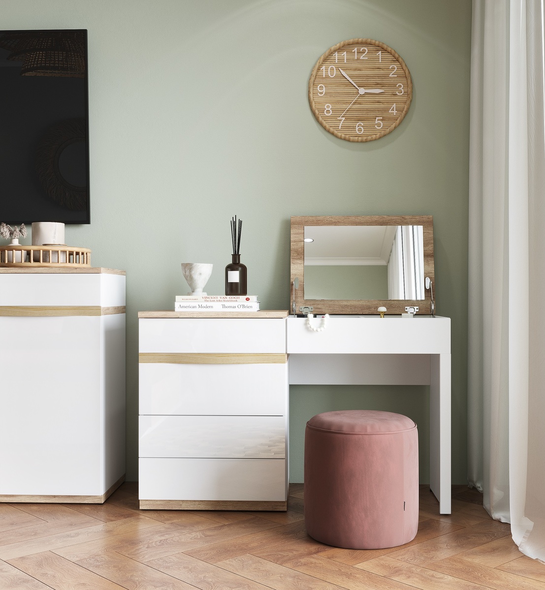 Туалетный стол с откидным зеркалом предназначен для комфортного ухода за собой и хранения украшений. Во вместительных выдвижных ящиках Вы сможете расположить не только косметику, аксессуары, предметы гигиены, но и более габаритные предметы: фен, стайлер и т.д.
