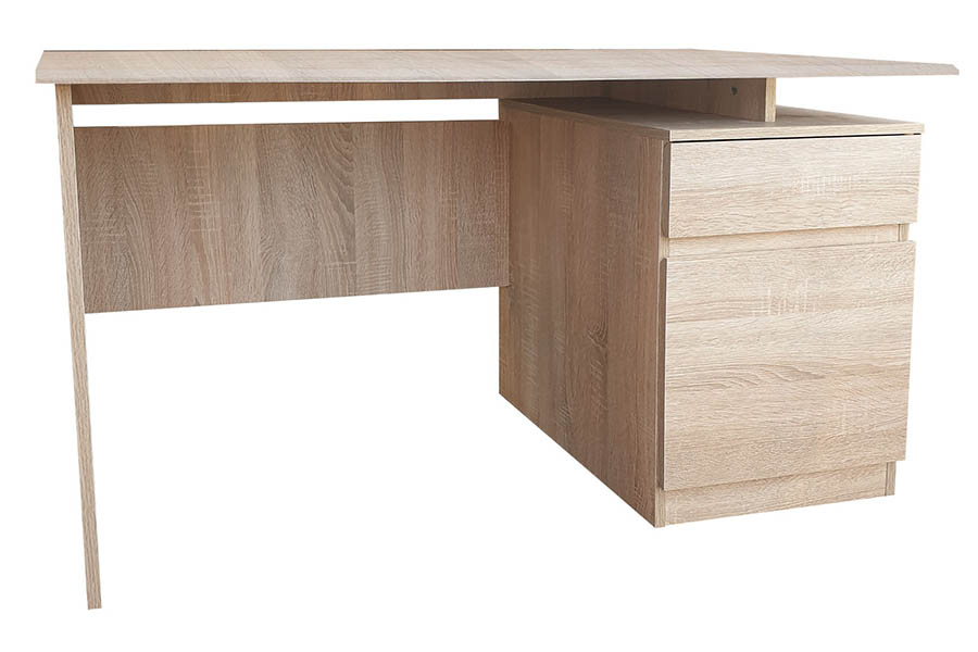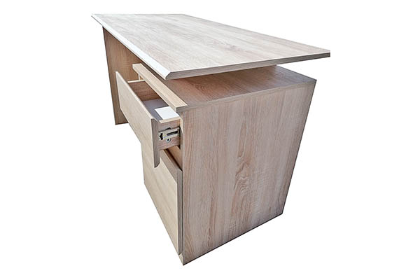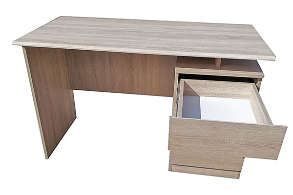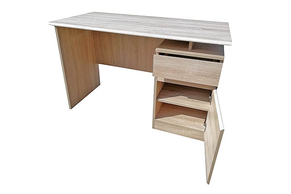 Стол изготовлен из однотонной ЛДСП с покрытием под дерево. Столешница имеет прямоугольную форму. Для хранения документов и книг предусмотрена тумба с выдвижным ящиком и двумя закрытыми полками. Модель также доступна в цвете «ясень снежный».