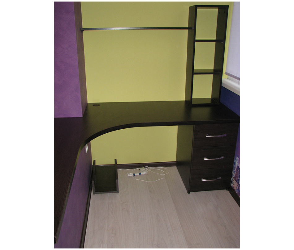 Угловой стол с несколькими открытыми полками и тумбой с выдвижными ящиками отличается удобством и функциональностью. Модель, представленная в цвете венге, изготовлена из ЛДСП высокого качества, гарантирующего столу прочность и надежность на весь срок службы.