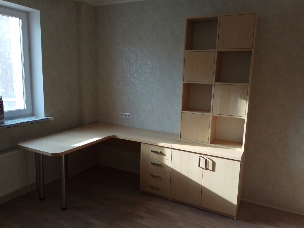 Широкая форма. Две дверцы, тумба с выдвижными ящиками и стеллаж.