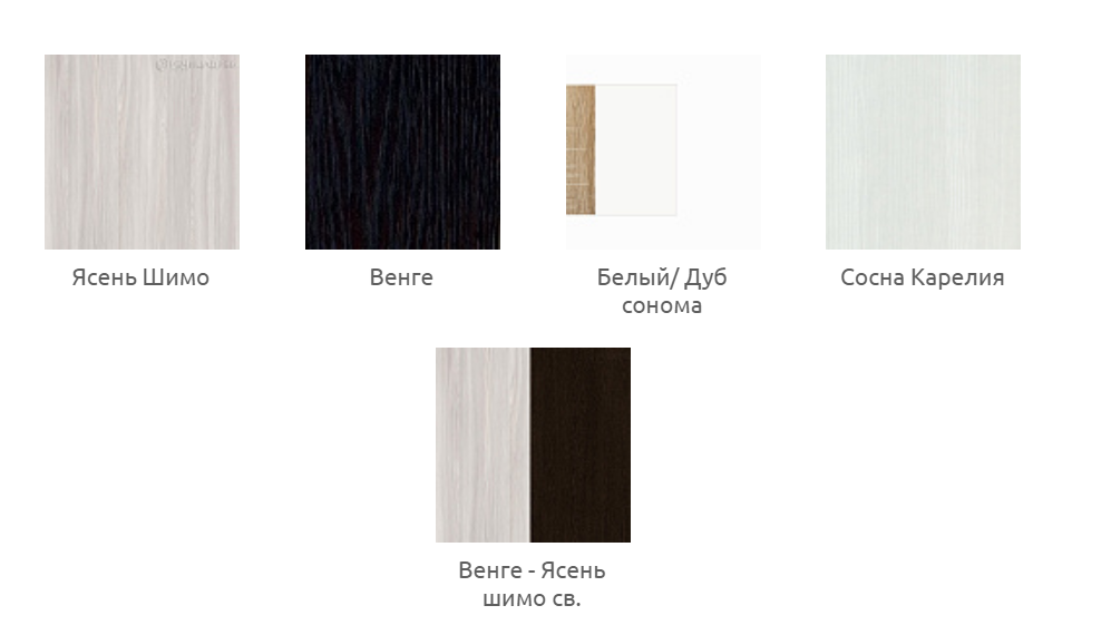 Цветовая гамма: венге, венге/дуб шамони, белый/дуб сонома, ясень шимо светлый, сосна.