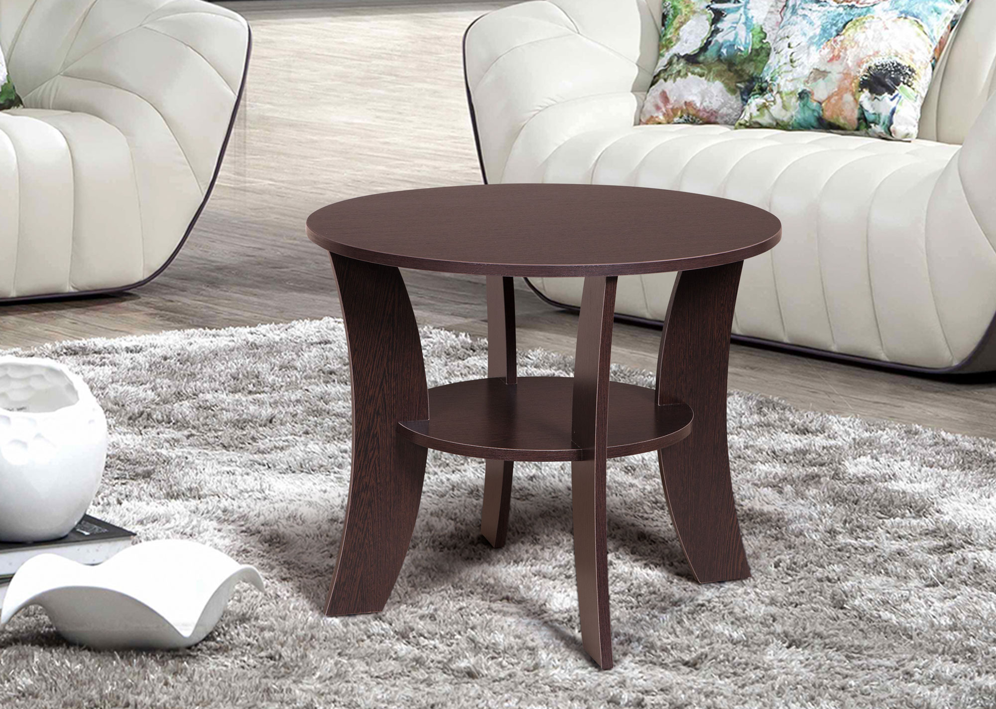 Яркий, красивый круглый журнальный стол создан для изысканного интерьера. Стол очень интересно смотрится благодаря фигурным ножкам. На столе будет прекрасно смотреться рамки для фотографий или ваза с фруктами, а на полочке можно разместить прессу или рукоделие.