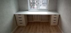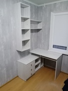 Комплект мебели в детскую: стол, шкаф, шуфляды, навесные угловые полки.