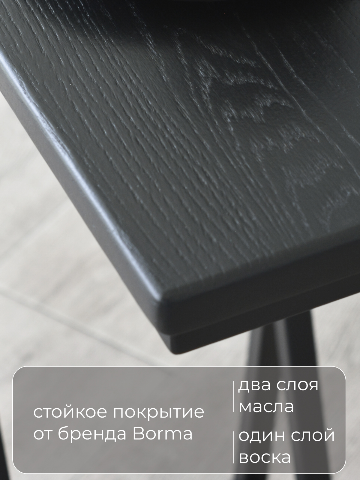Полимерное покрытие подстолья — устойчиво к воде, царапинам и появлению ржавчины. На ножках стола установлены фетровые подкладки, которые защищают пол от царапин и черных следов. Массив дуба, используемый для изготовления столешницы — приятный на ощупь материал, покрытый двумя слоями итальянского масла Borma и специальным воском, которые позволят столу сохранить свой первоначальный вид на протяжении длительного времени.