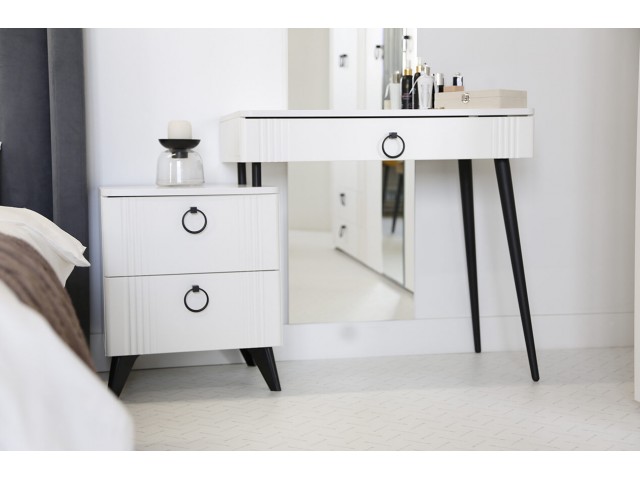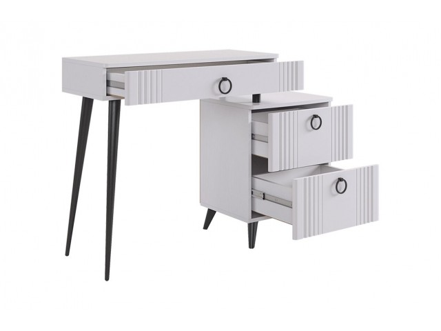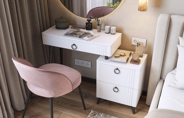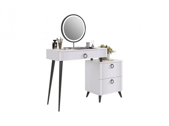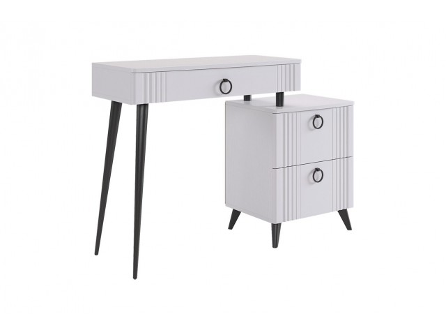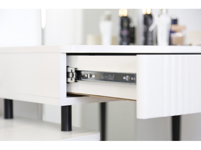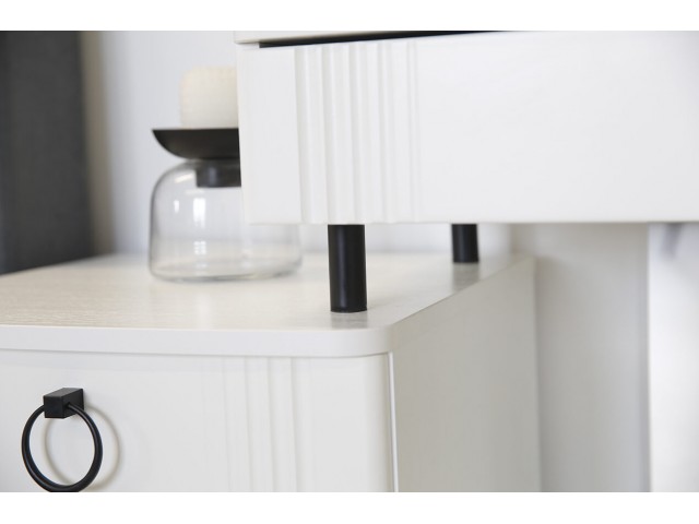 Туалетный столик Ева прекрасно впишется в интерьер спальни или ванной комнаты благодаря своему стильному дизайну и функциональности. Вместительные выкатные ящики обеспечат удобное хранение косметики, украшений и других мелочей. Шариковые направляющие гарантируют легкость открывания и закрывания ящиков, а металлические ручки добавляют стильный акцент. Высокие черные опоры придают столику устойчивость и элегантность. Цветовое сочетание белого корпуса из ЛДСП и фасада из МДФ облицованного пленкой ПВХ создает свежий и модный образ мебели. Необычная фрезеровка фасада добавляет изысканности и утонченности этому туалетному столику.