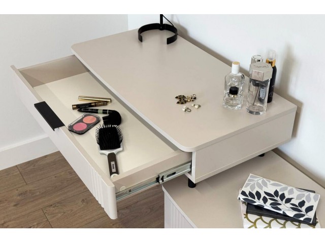 Благодаря своему дизайну трюмо «Катрин» легко впишется в любой интерьер и гармонично сочетается с другими модулями спальни «Катрин». Выкатные ящики предоставляют достаточно места для хранения различных предметов, а возможность использования трюмо в качестве письменного стола делает его универсальным элементом мебели.