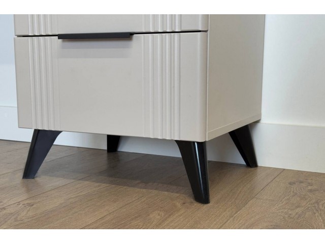 Трюмо изготовлено из качественных материалов: корпус выполнен из ЛДСП, что гарантирует прочность и долговечность, а фасад из МДФ в плёнке ПВХ не только выглядит эстетично, но и защищает трюмо от повреждений. Особое внимание заслуживает фрезеровка фасадов, которая придаёт изделию изысканный вид.
