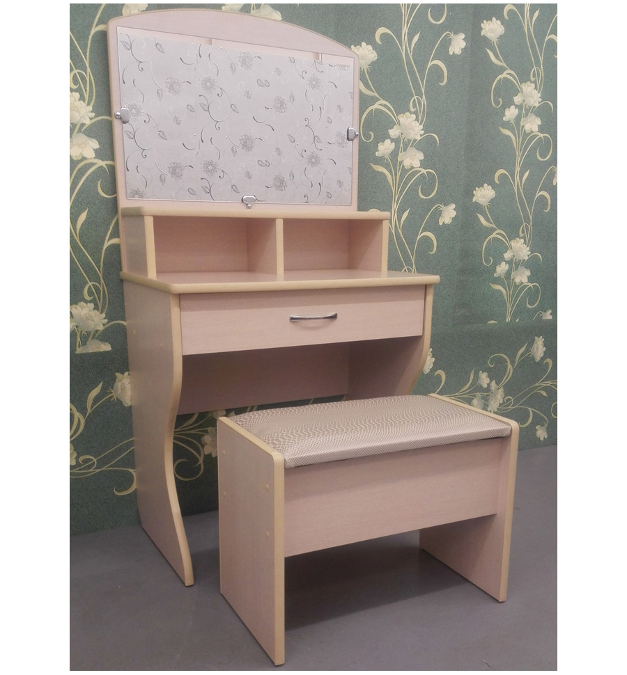 Туалетный столик с пуфиком предназначены для спальной комнаты. Столик комплектуется зеркалом, под ним предусмотрены открытые ниши и выдвижной ящик. Пуфик обладает мягким сиденьем, что позволит разместиться с наибольшим комфортом.