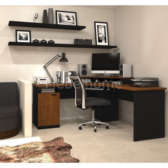 Широкий стол с выдвижными ящиками и двумя навесными полками.