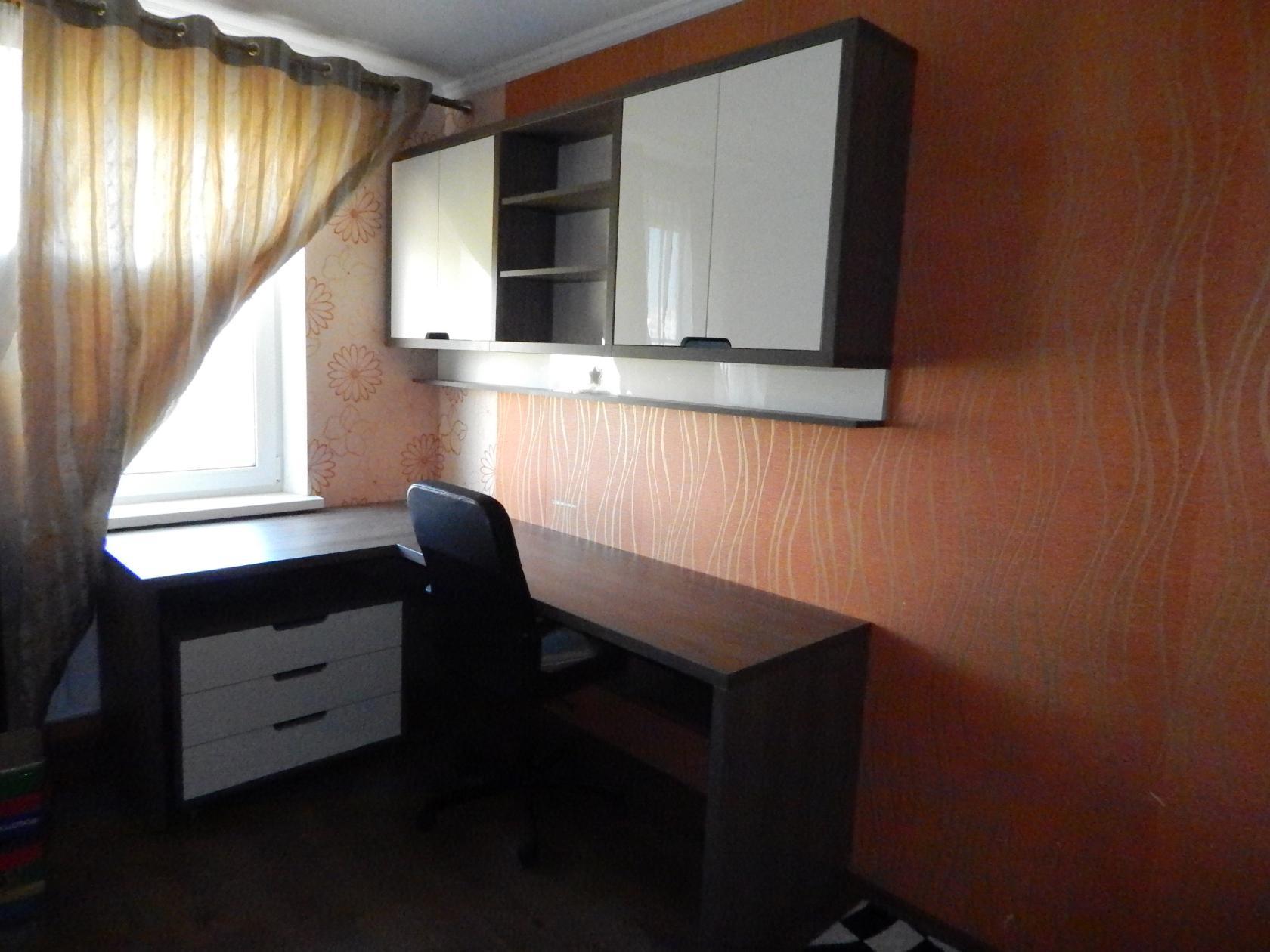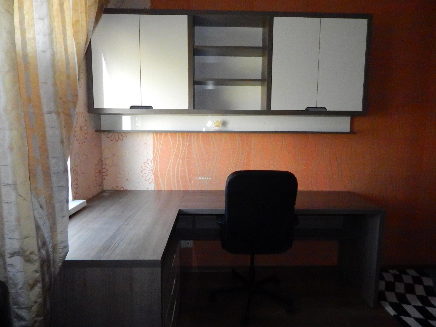 Небольшой компьютерный стол в комплекте с комодом и навесной полкой.