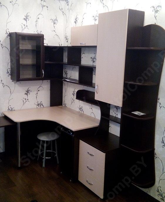 Просторный угловой рабочий стол с каркасом цвета венге в контраст светлым фасадам и столешнице. Он выполнен из ламинированного ДСП (18 мм), кромка из ПВХ.
