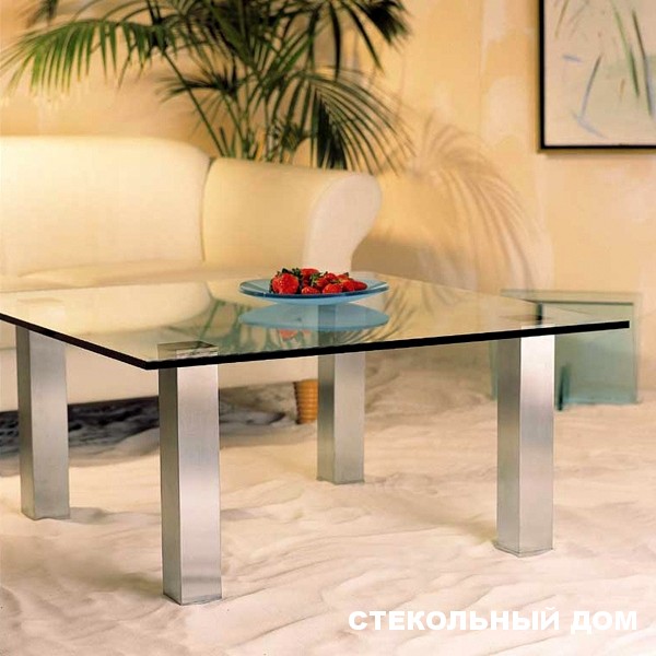 Креативный дизайном журнальный столик в лучших традициях минимализма и хай-тека, со свойственным ему гармоничным сочетанием металла и стекла. Квадратная столешница и толстого закаленного стекла крепится непосредственно к четырем массивным алюминиевым опорам, придавая ощущение невесомости.