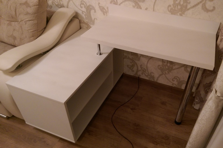 Стол-стеллаж белого цвета на устойчивых опорах.