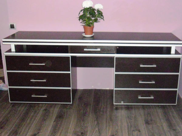 Прямой стол с двумя тумбами и широкой выдвижной полкой для клавиатуры.