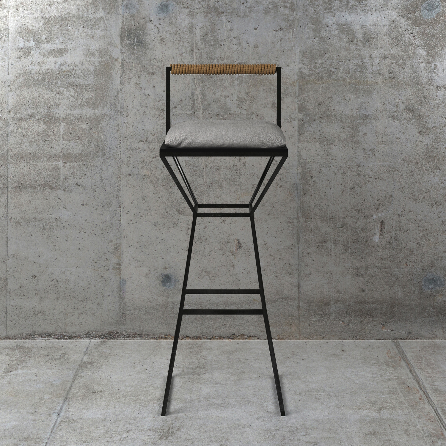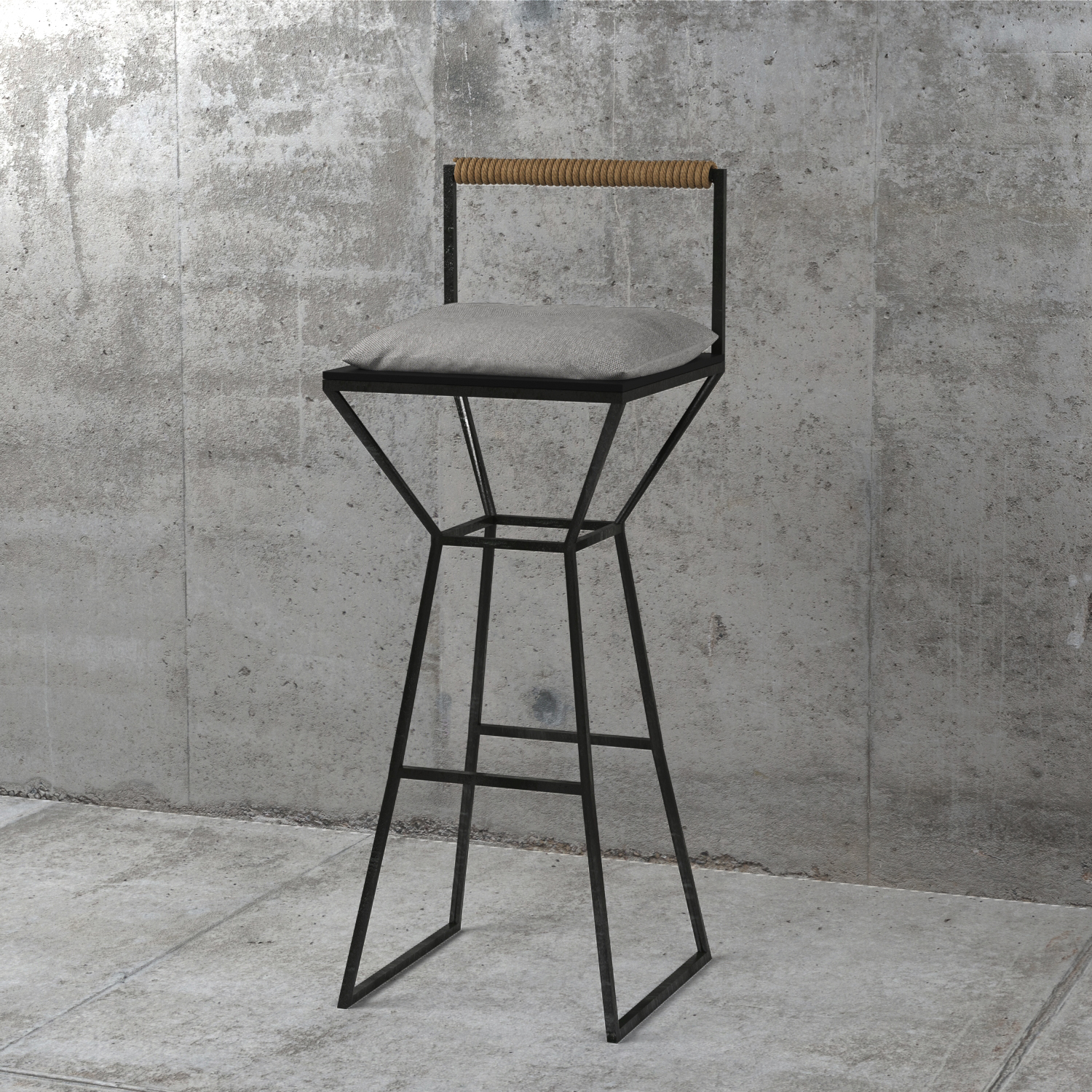 Барный стул на металлическом каркасе из труб квадратного сечения в черной окраске. Надежные рамные ножки сужаются к середине и расширяются к самому сиденью, которое крепится на воронкообразном основании. Невысокая спинка также в виде рамы может быть смягчена на усмотрение заказчика.