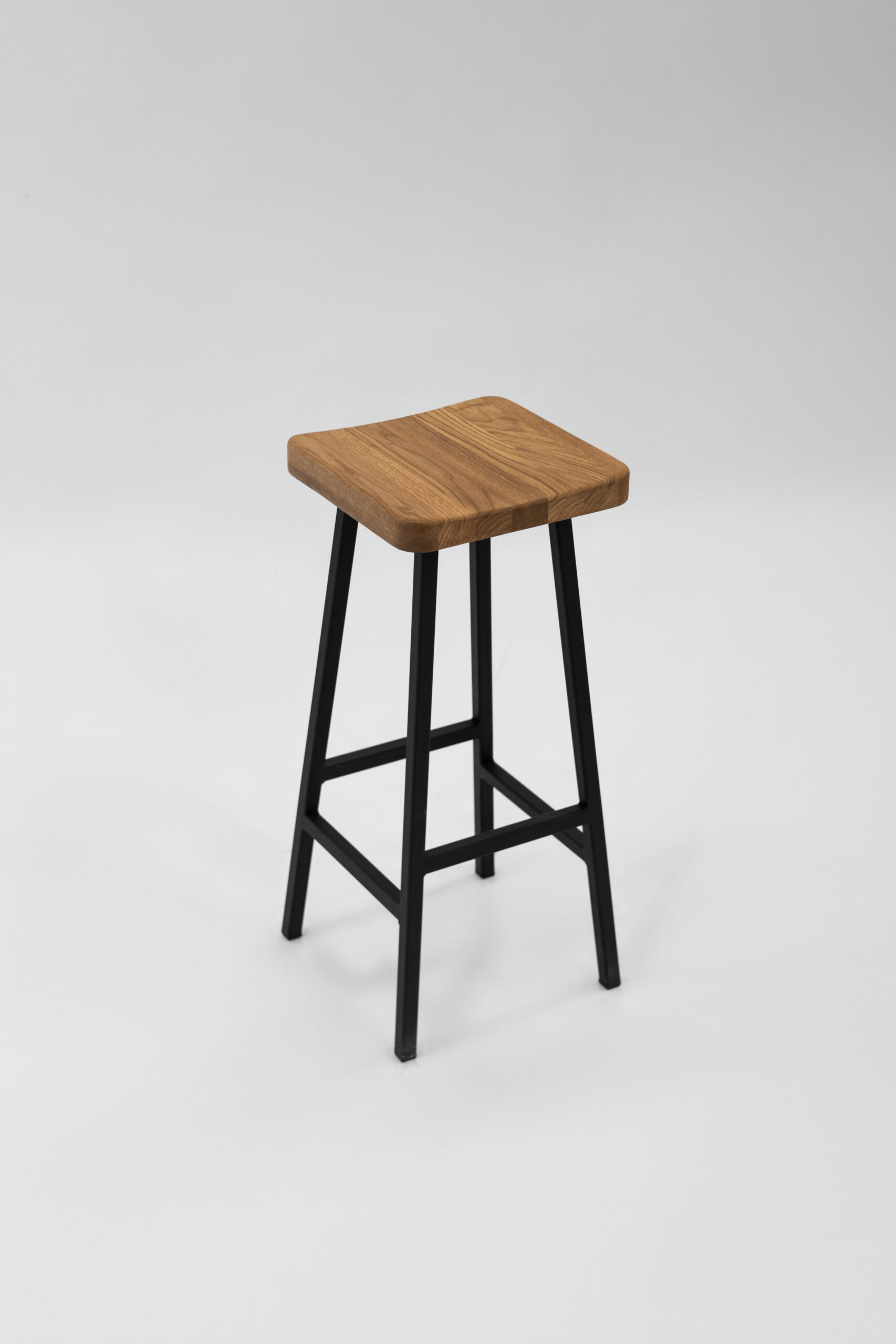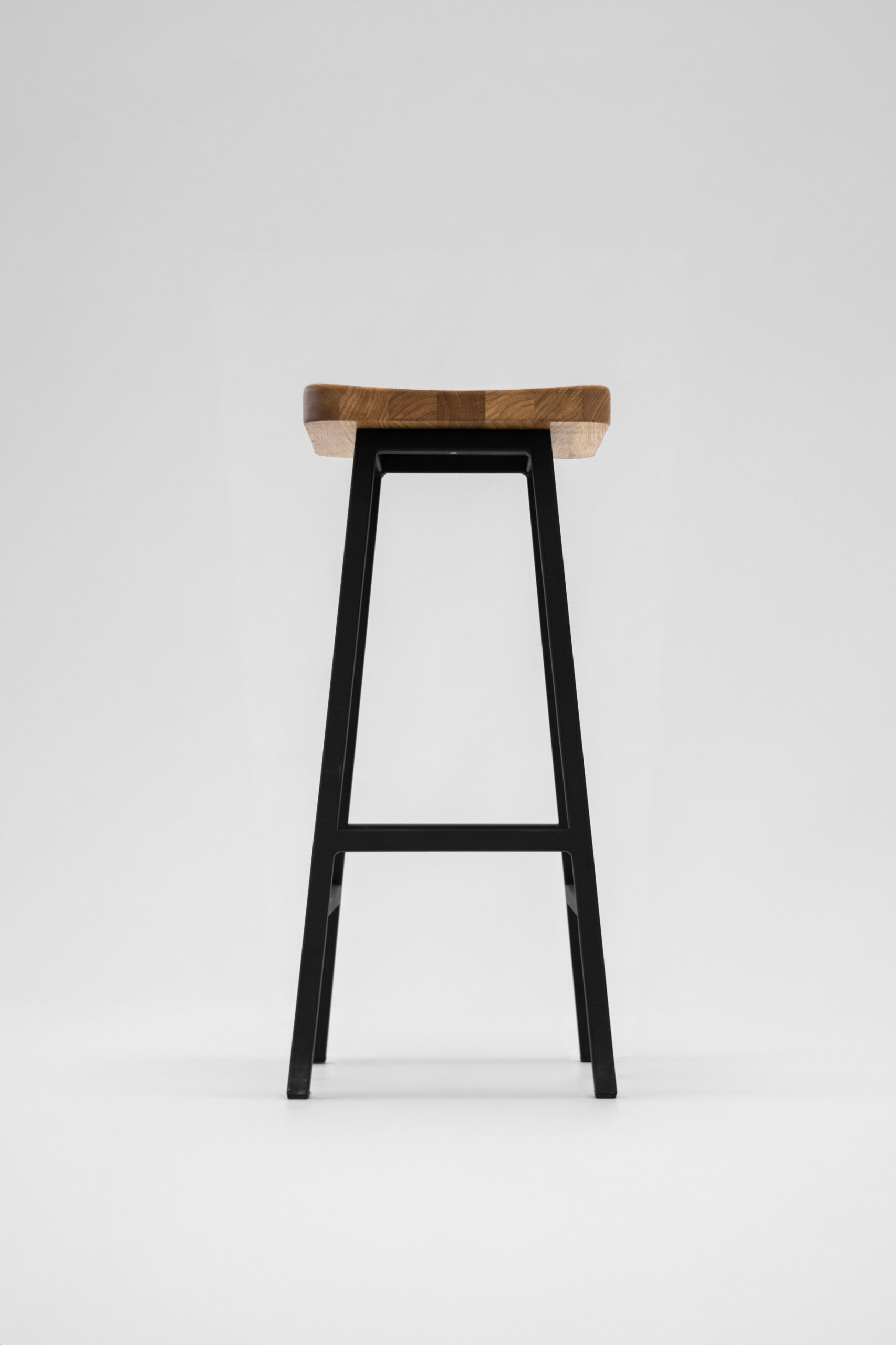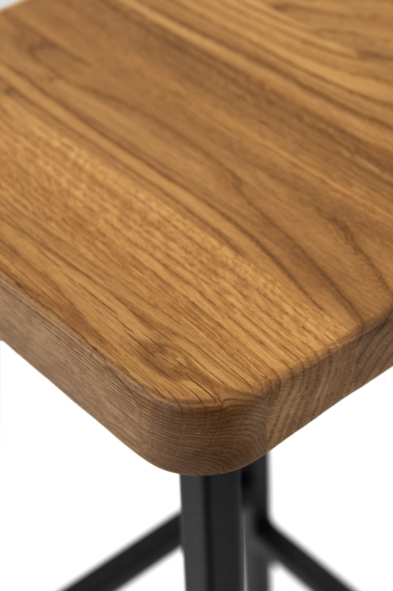 Барный стул со спинкой и вогнутым сиденьем. Материал: цельноламельный массив дуба, металл.