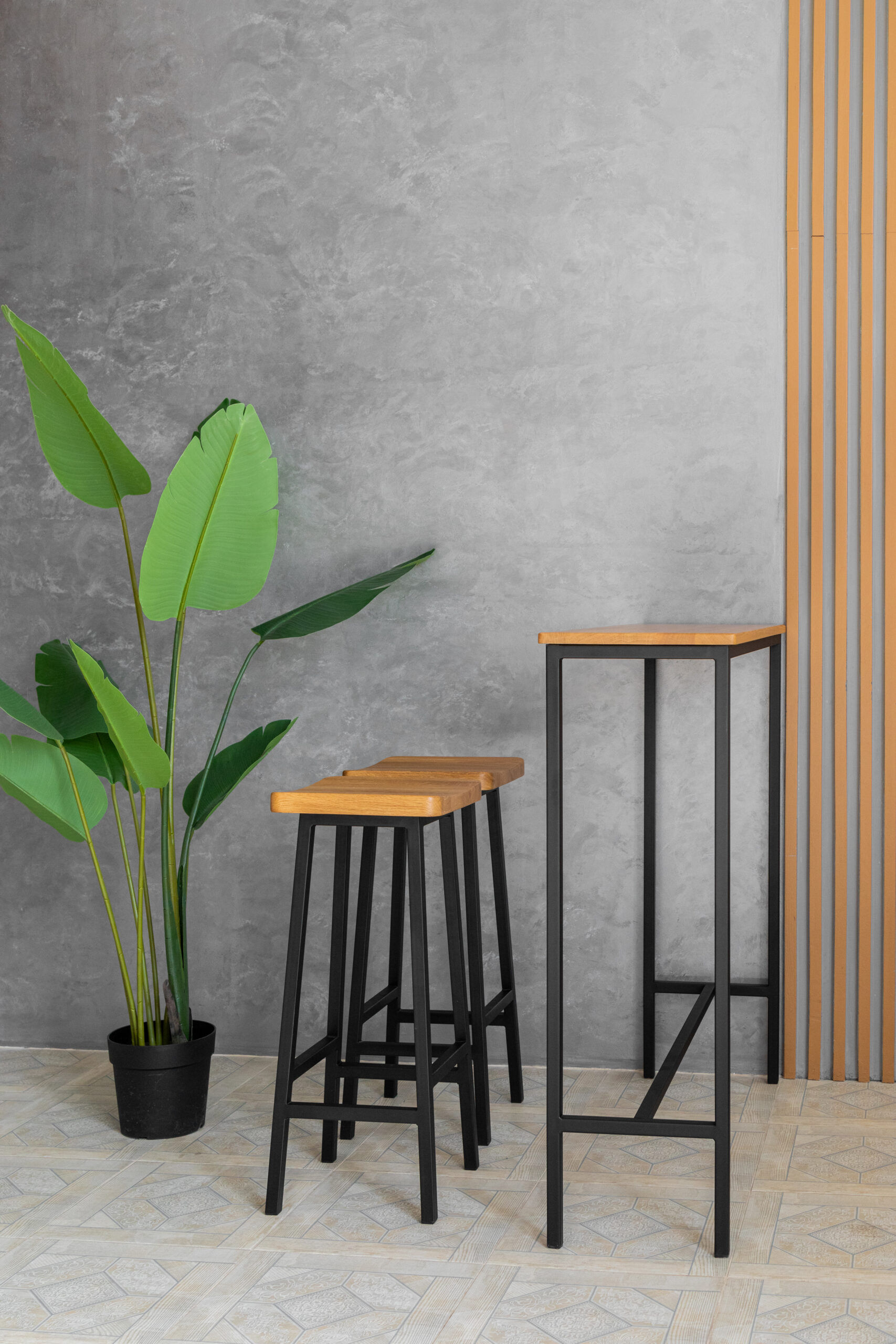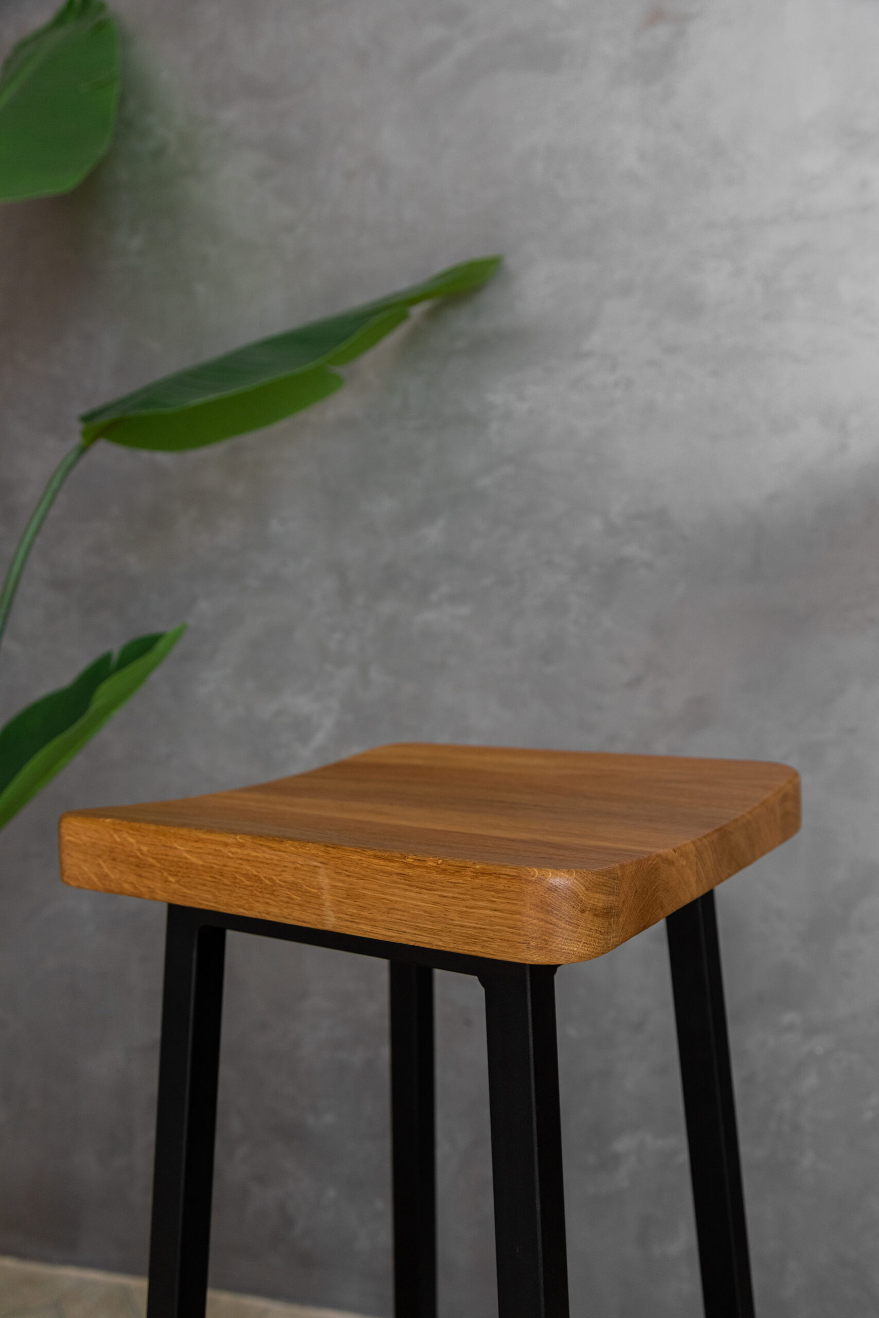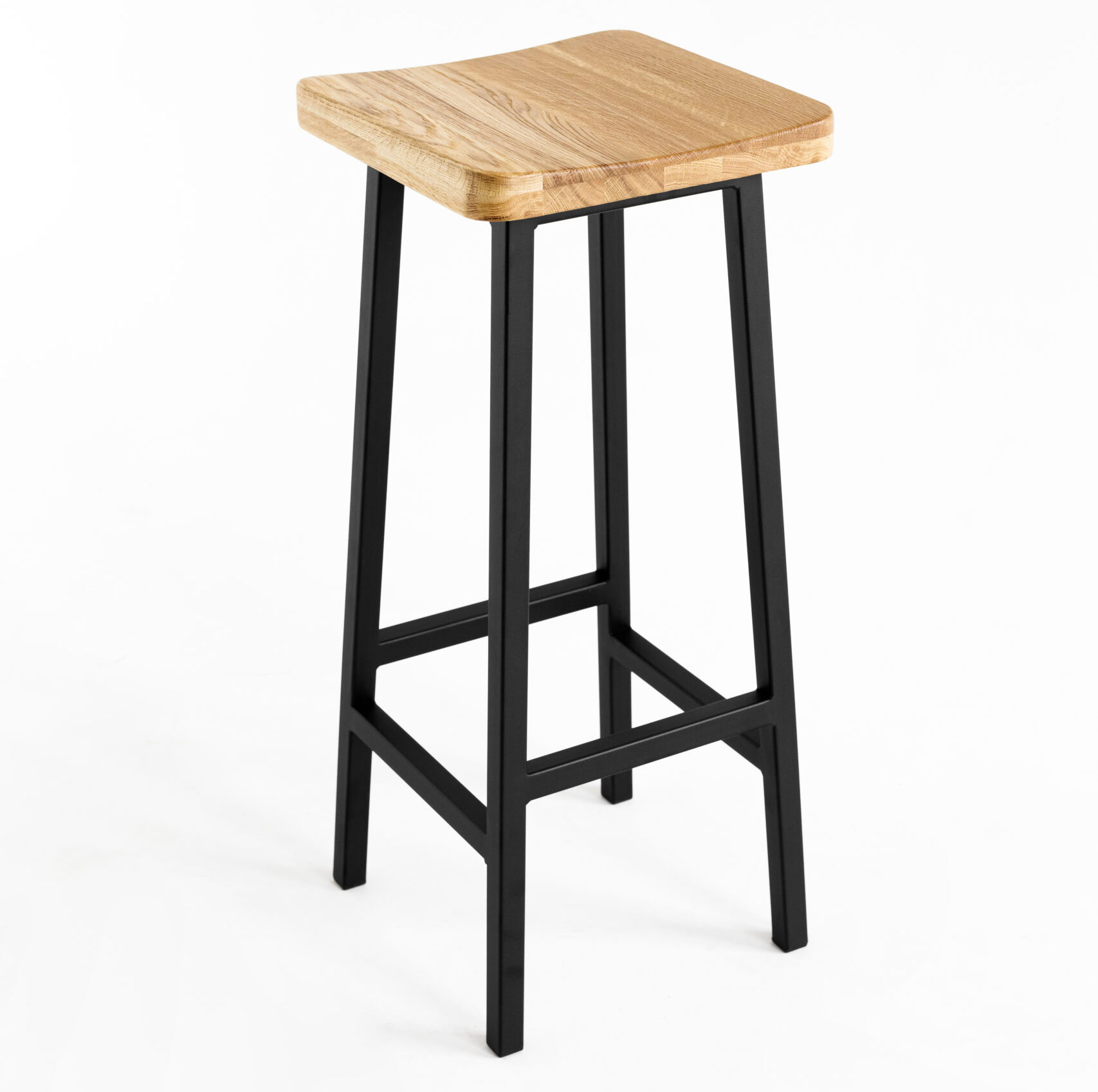 Высокий деревянный табурет, высота 78 см. Материал: цельноламельный массив дуба, металл.