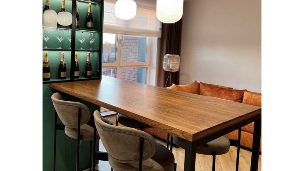 Высокий деревянный табурет, высота 78 см. Материал: цельноламельный массив дуба, металл.