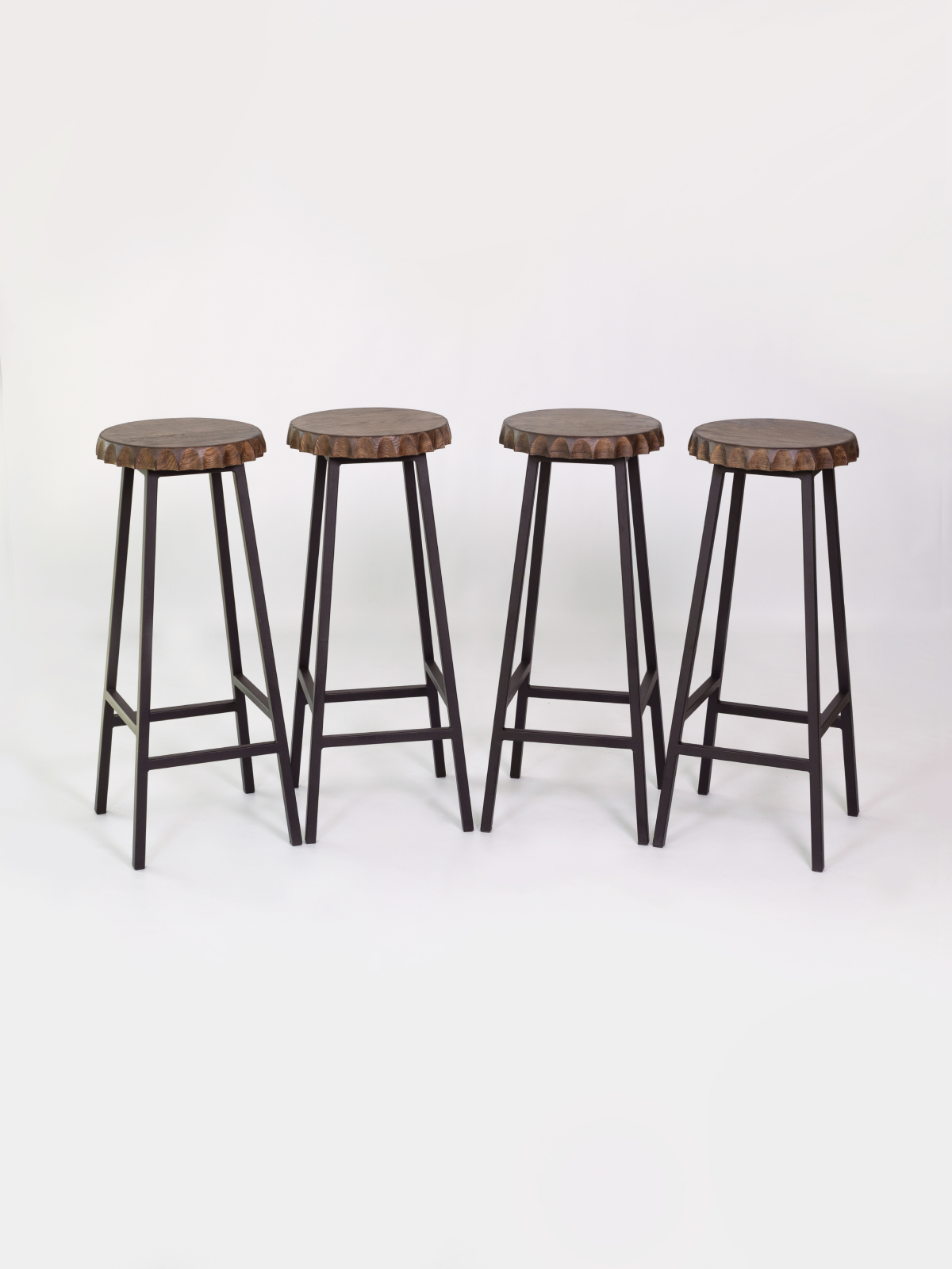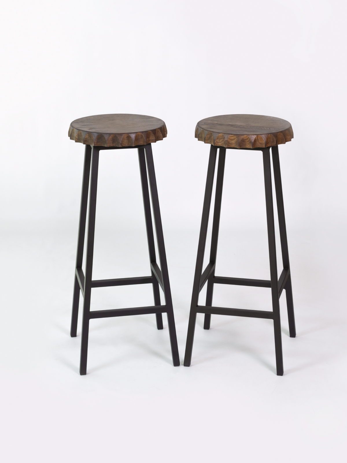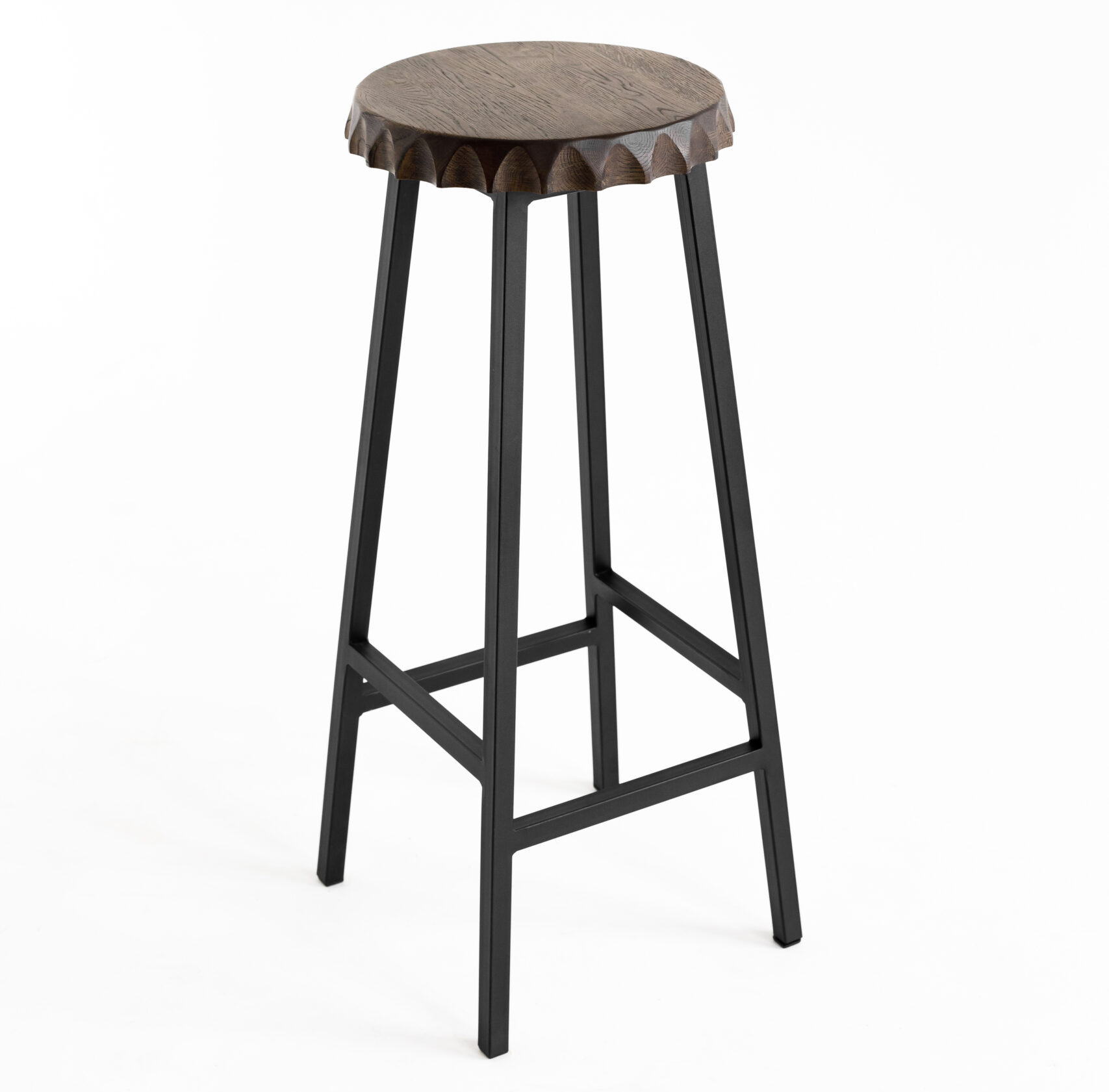 код 140876Высокий барный табурет. Форма сиденья: пивная крышка. Материал: цельноламельный массив дуба, металл.