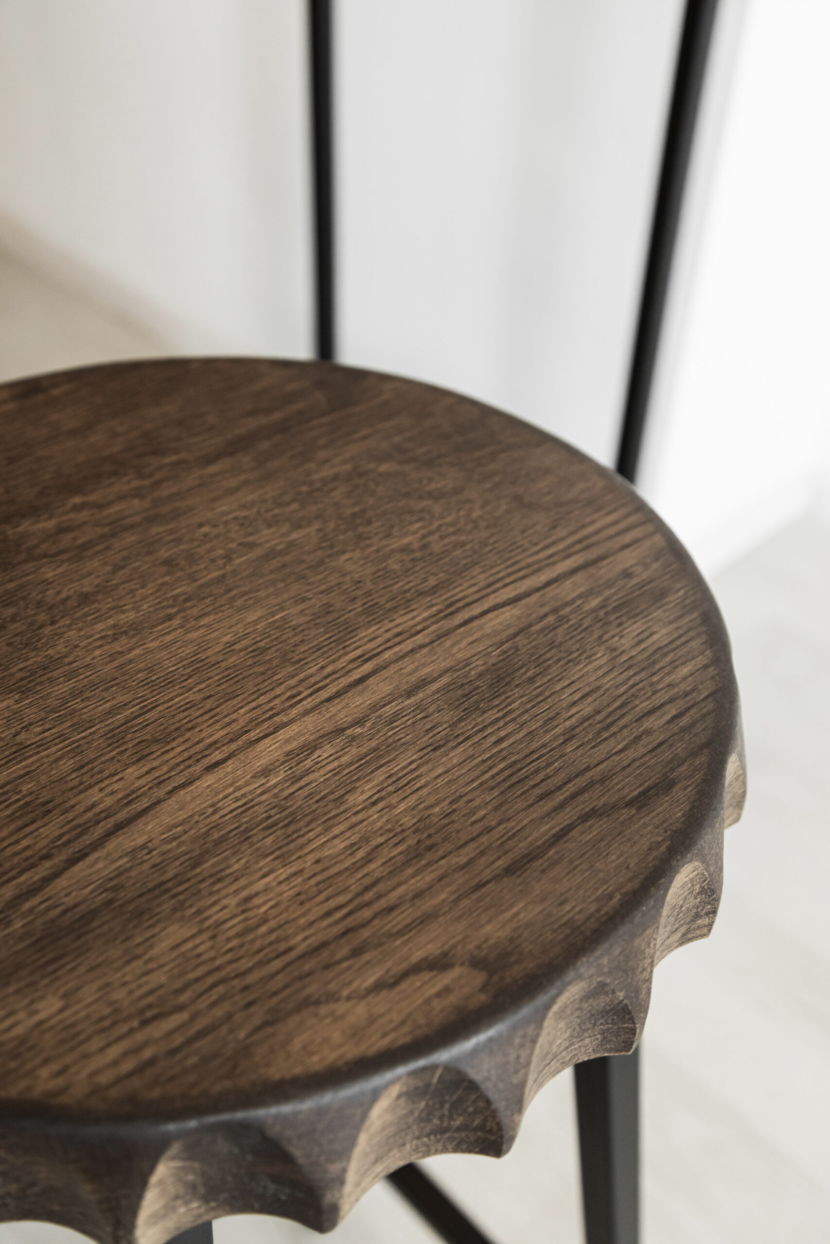 Полубарный стул со спинкой и вогнутым сиденьем. Материал: цельноламельный массив дуба, металл.