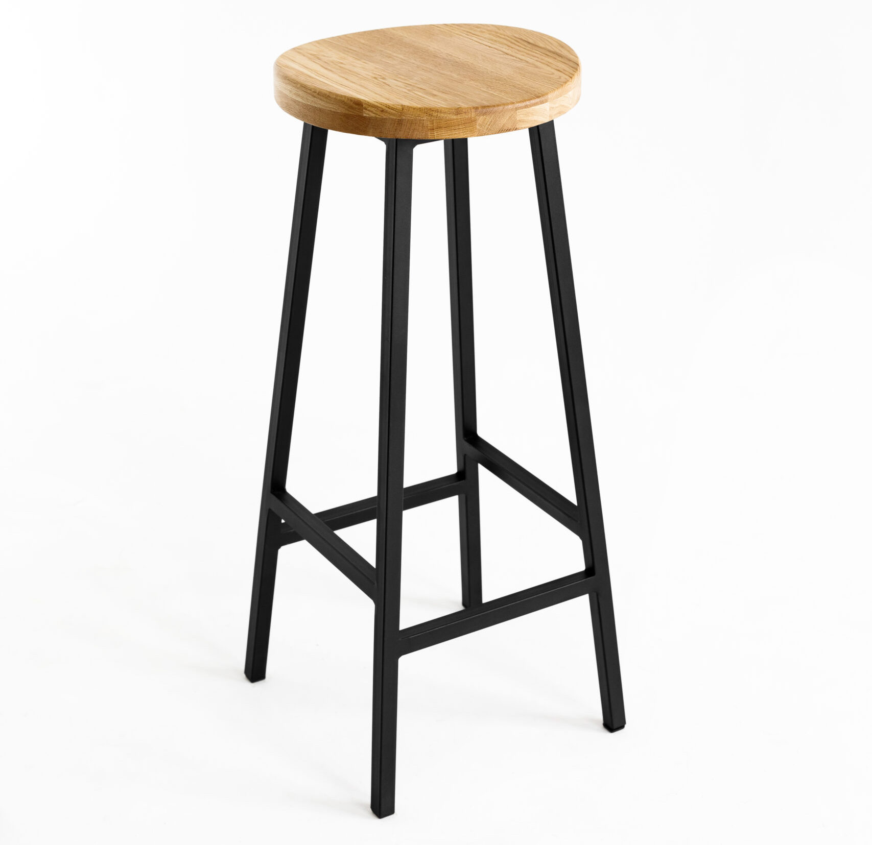 Полубарный табурет. Форма сиденья: пивная крышка. Материал: цельноламельный массив дуба, металл.