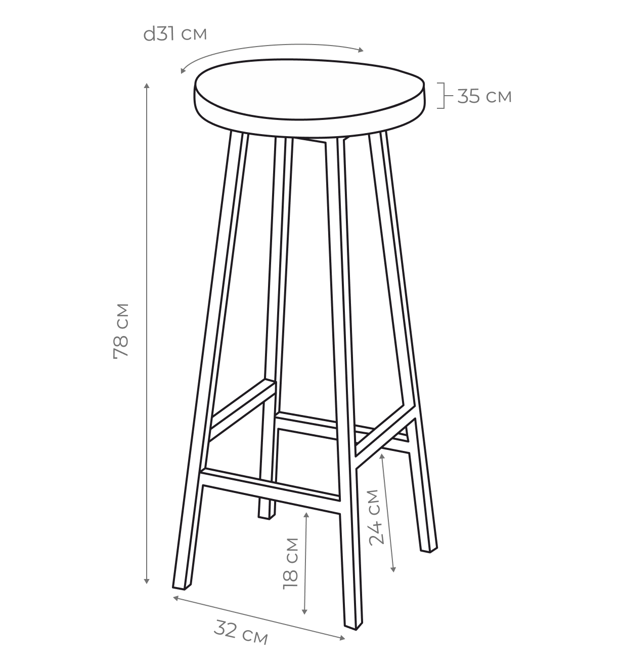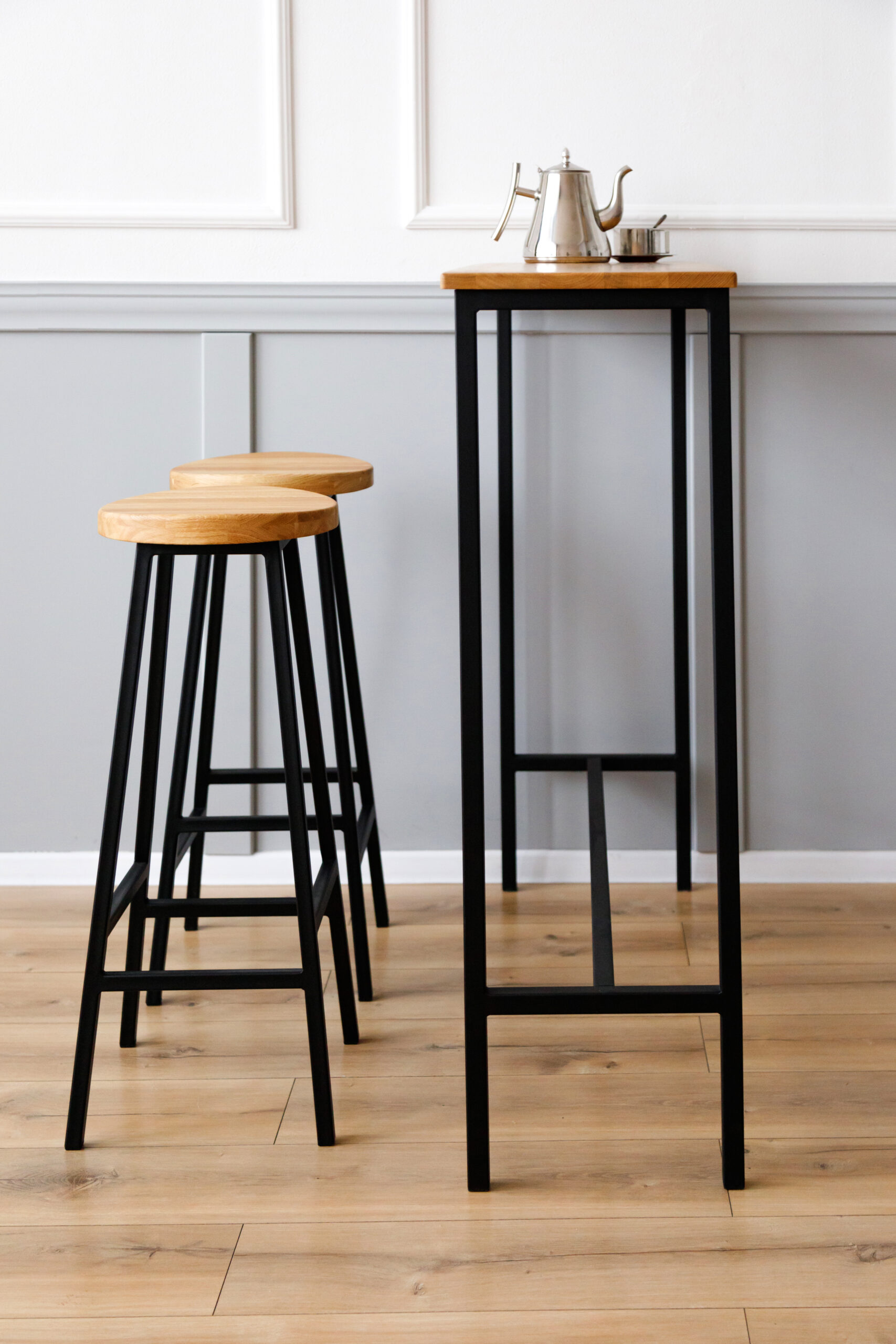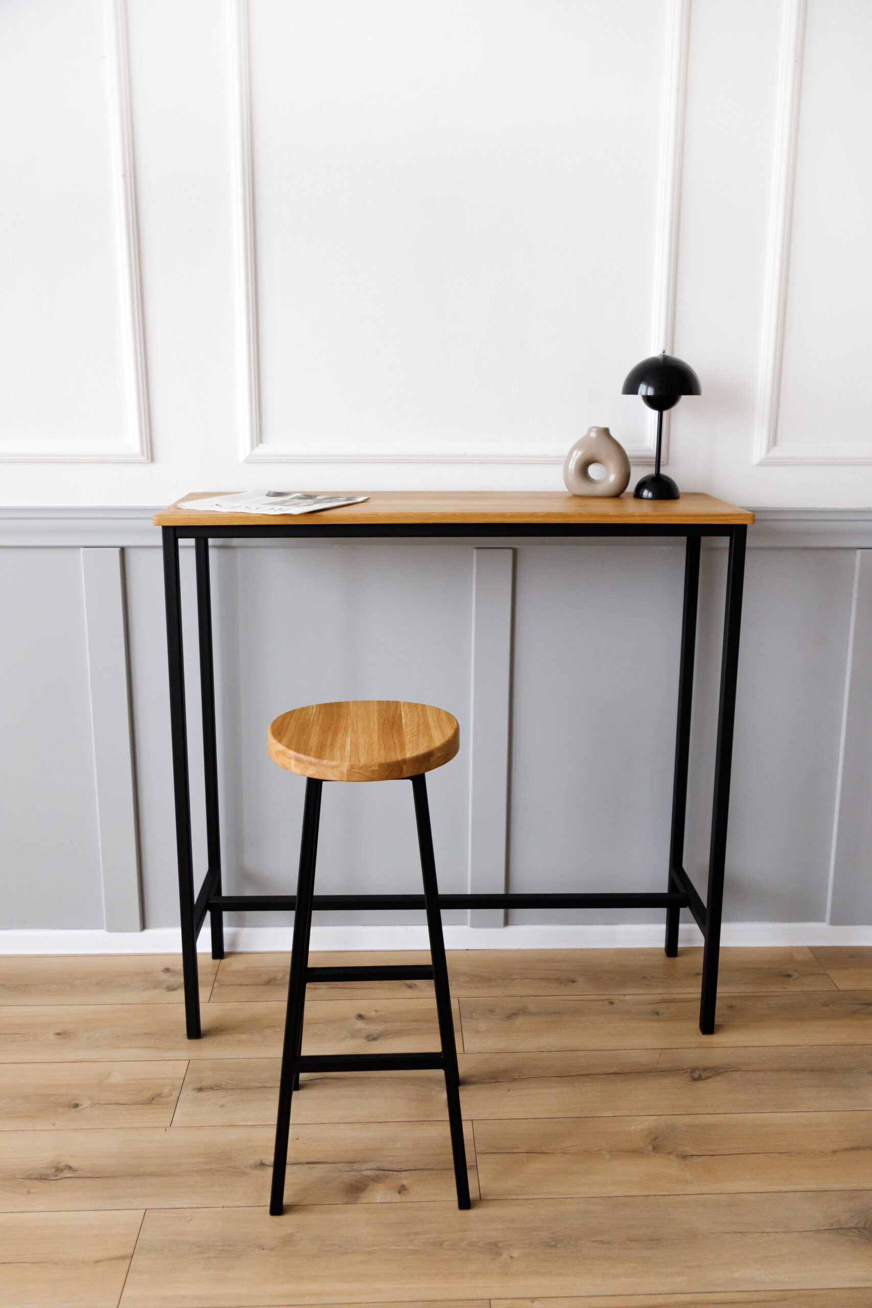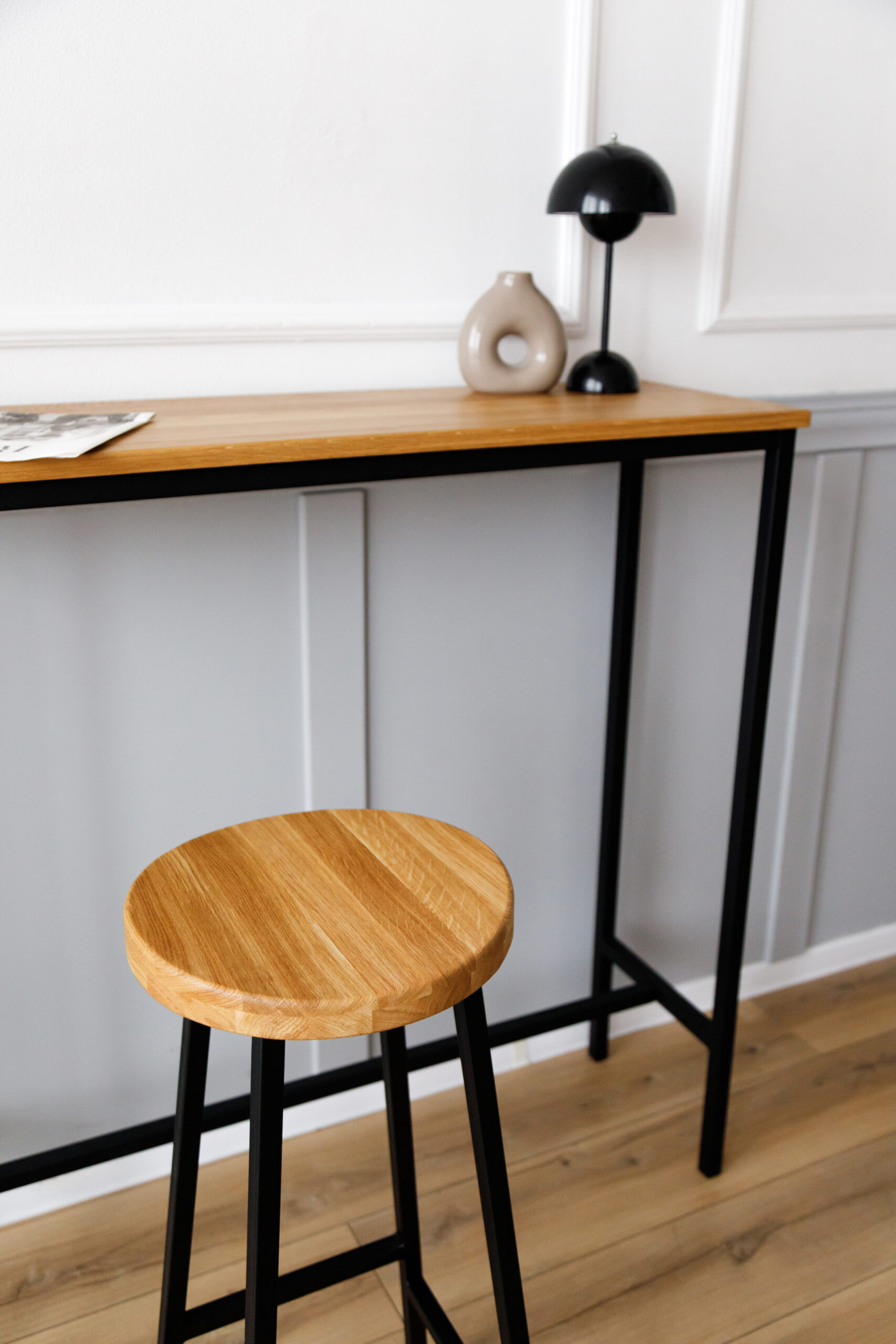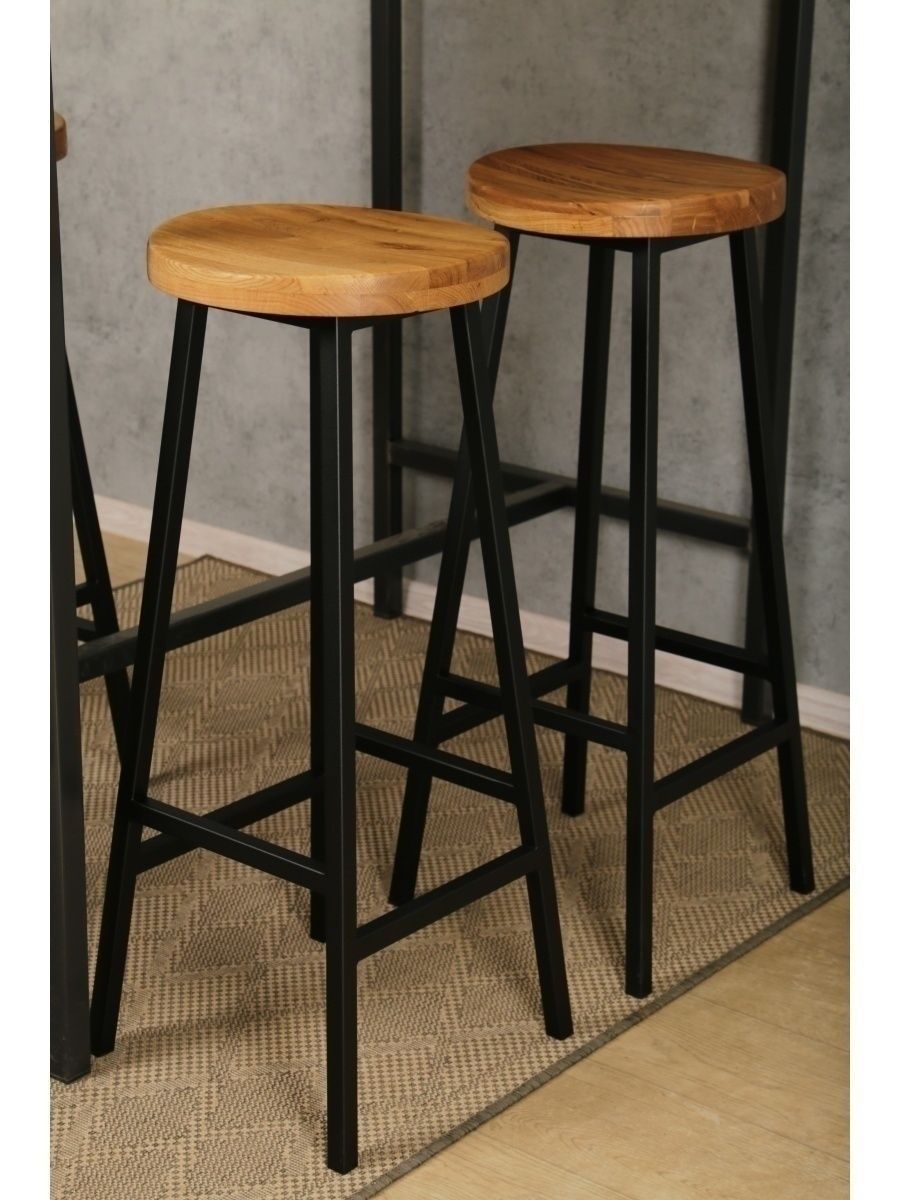 Высокий деревянный табурет, высота 78 см. Материал: цельноламельный массив дуба, металл.