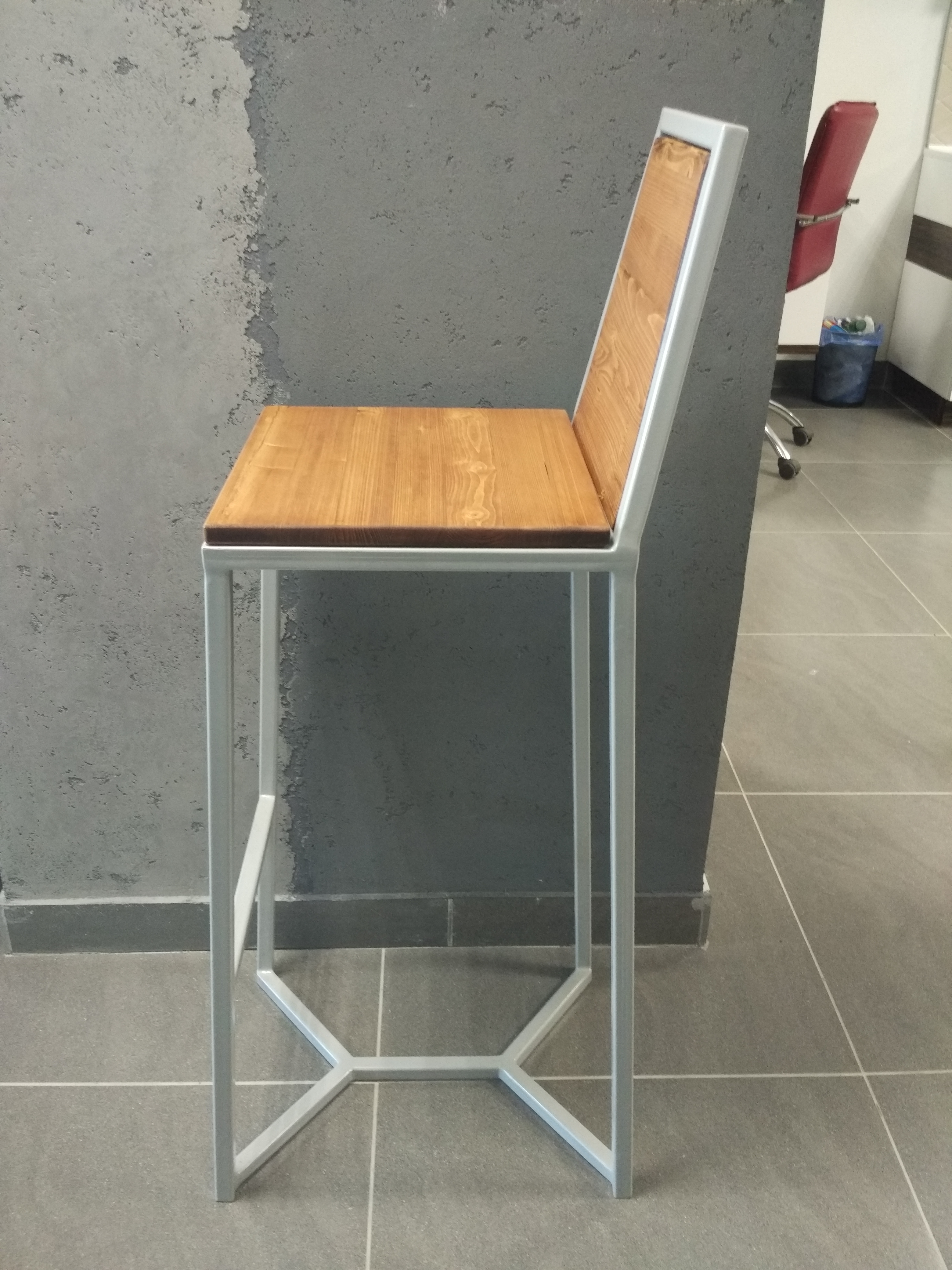 Высокий деревянный табурет, высота 76 см. Материал: цельноламельный массив дуба, металл.