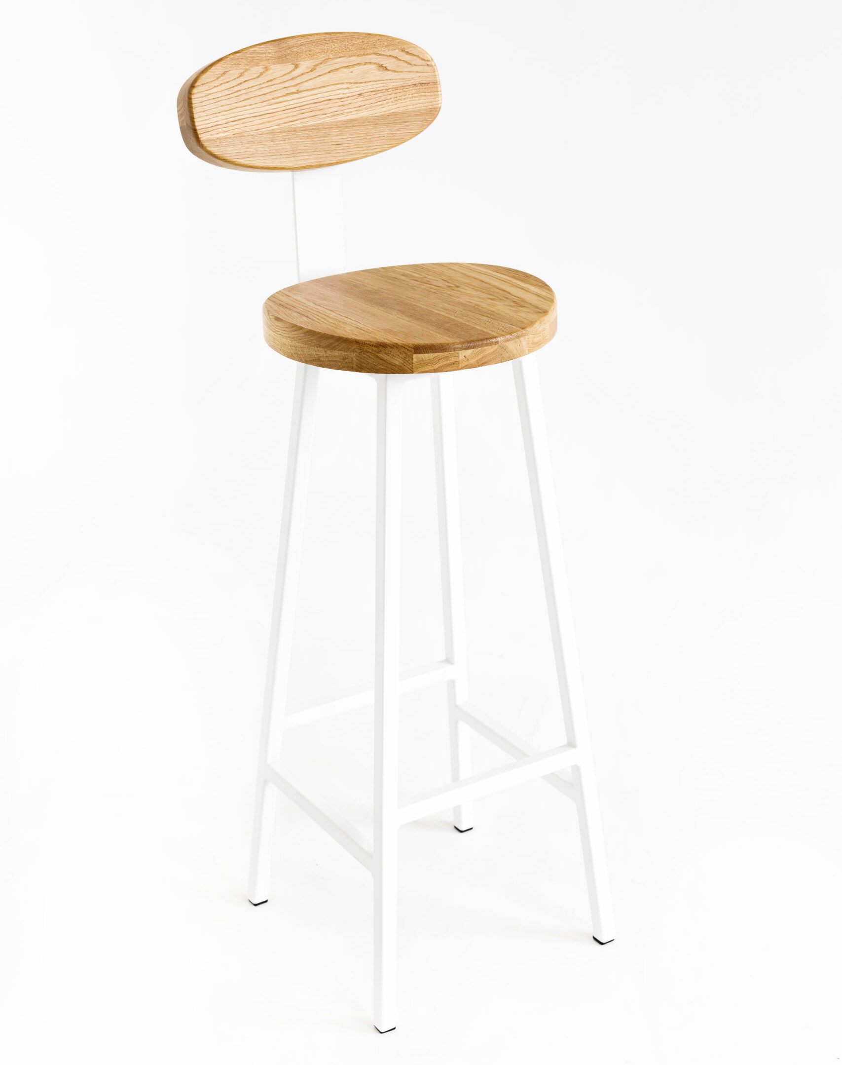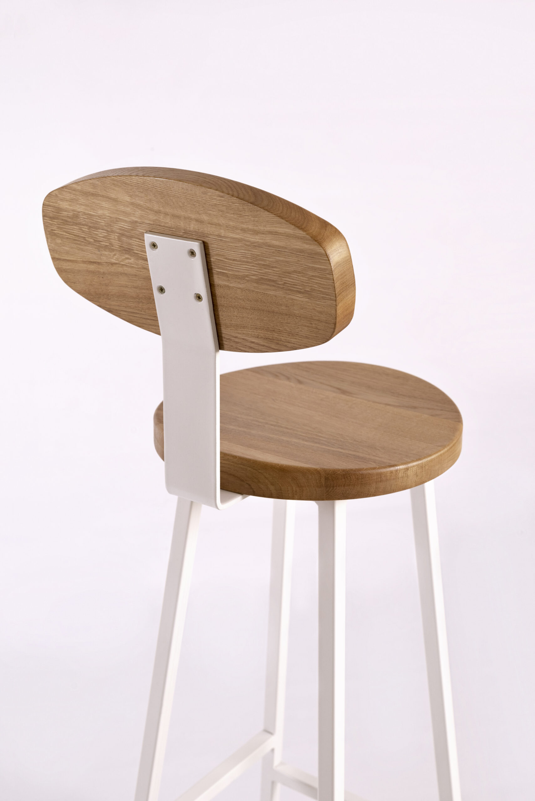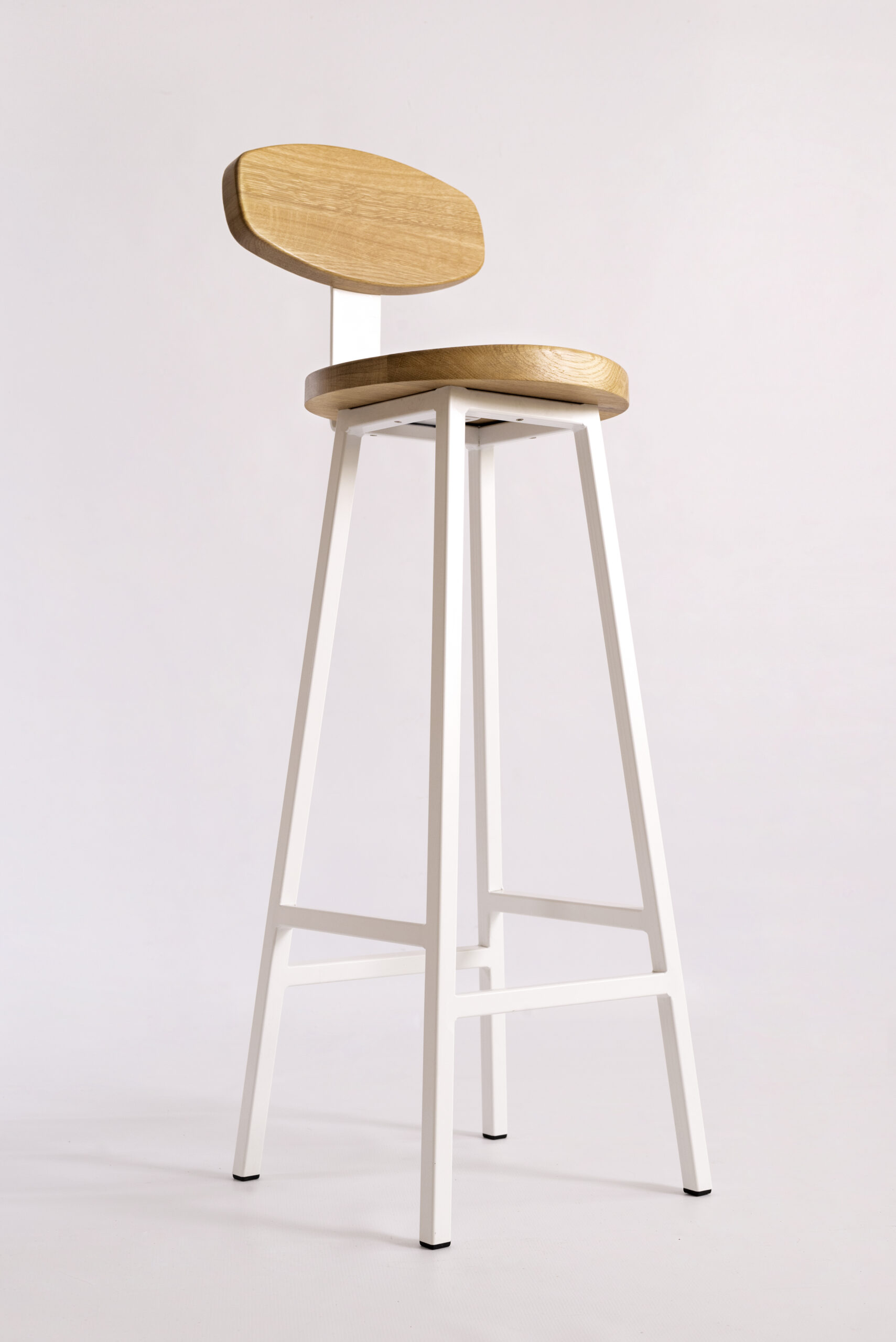 код 140872Барный стул со спинкой и вогнутым сиденьем. Материал: цельноламельный массив дуба, металл.
