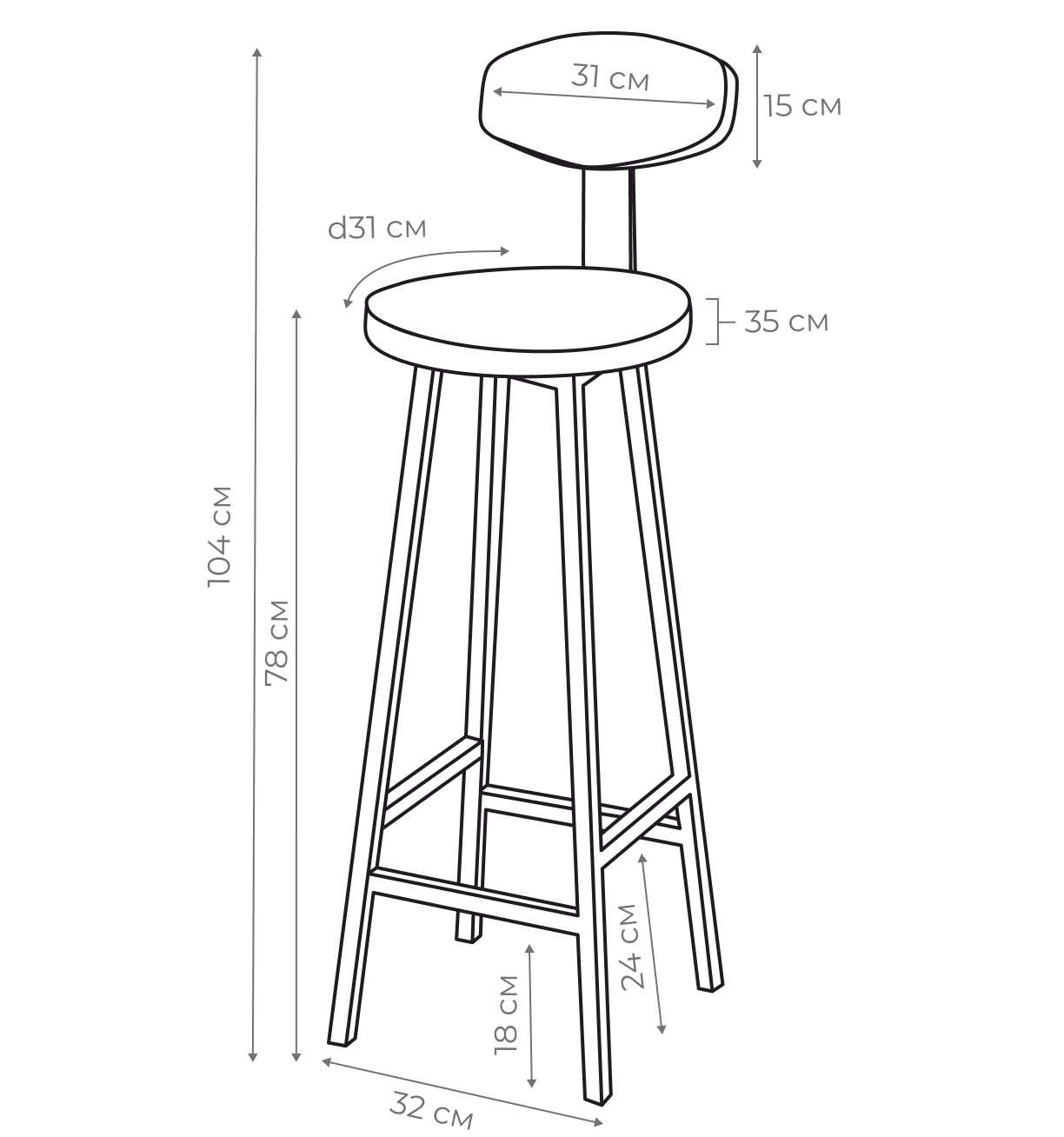 Высота — 78 см, с учетом спинки — 104 см