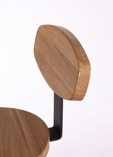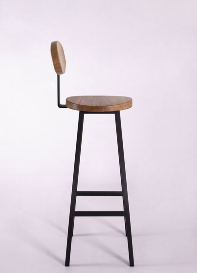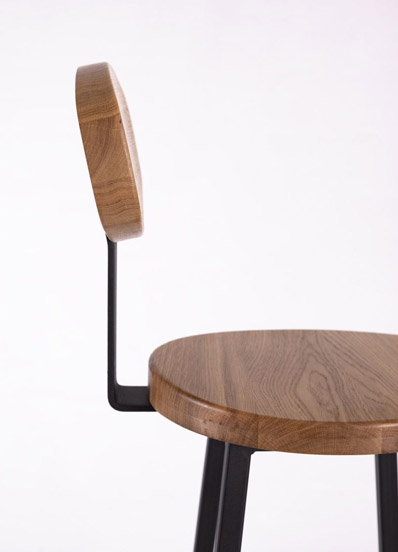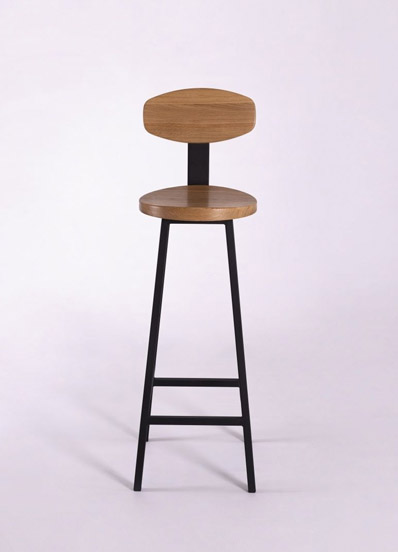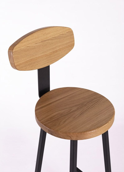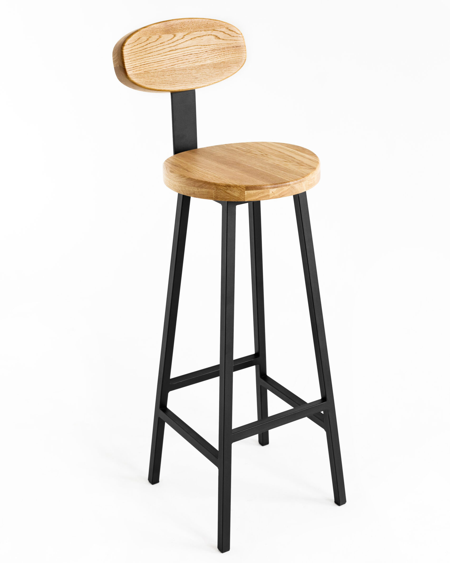 Барный стул со спинкой и вогнутым сиденьем. Материал: цельноламельный массив дуба, металл.